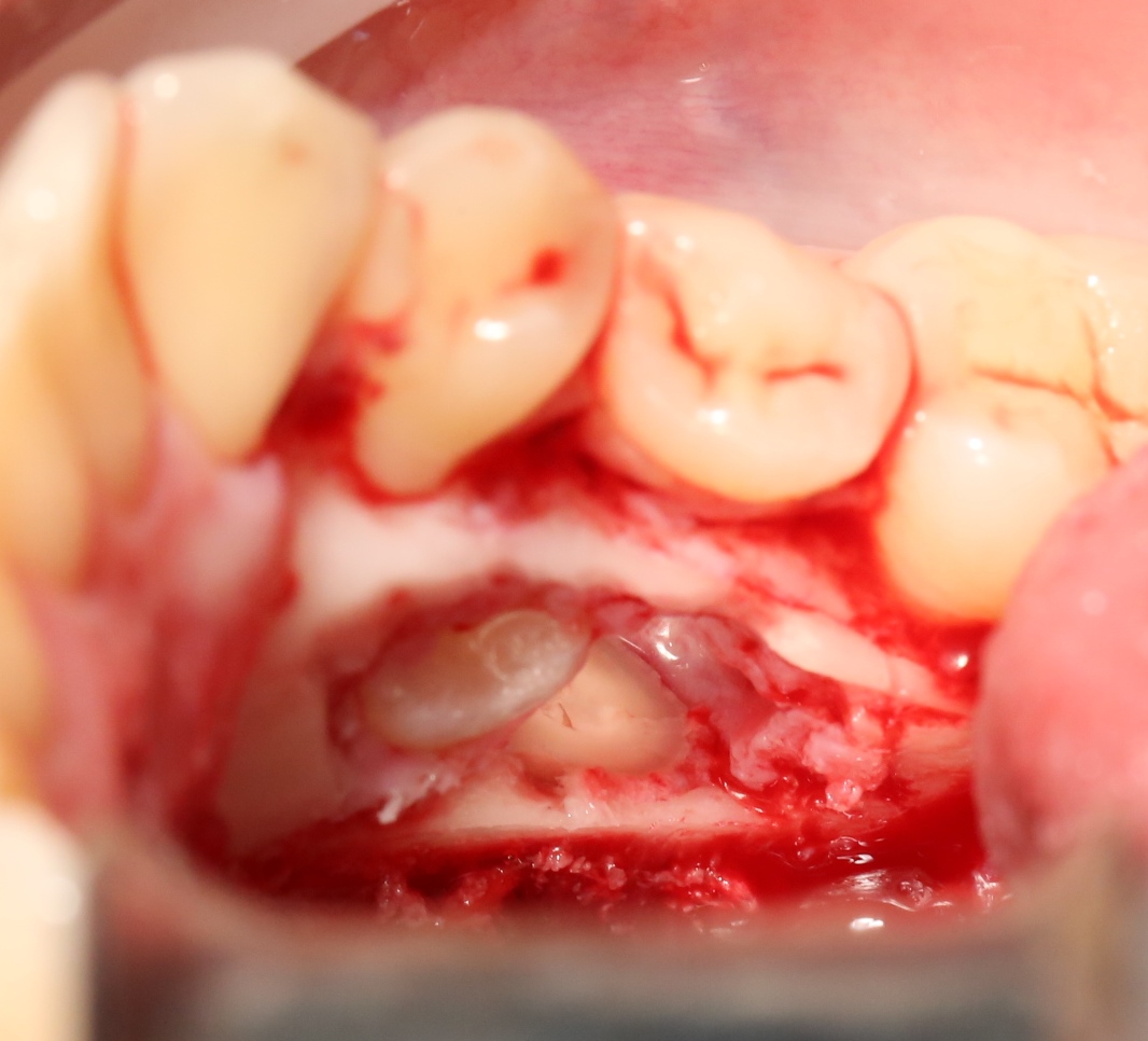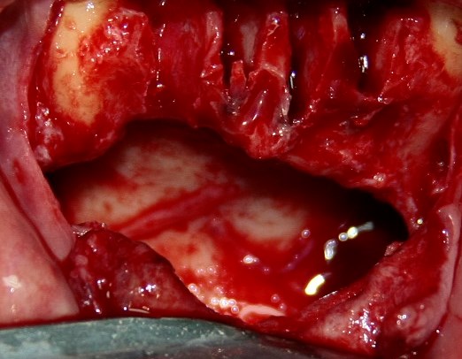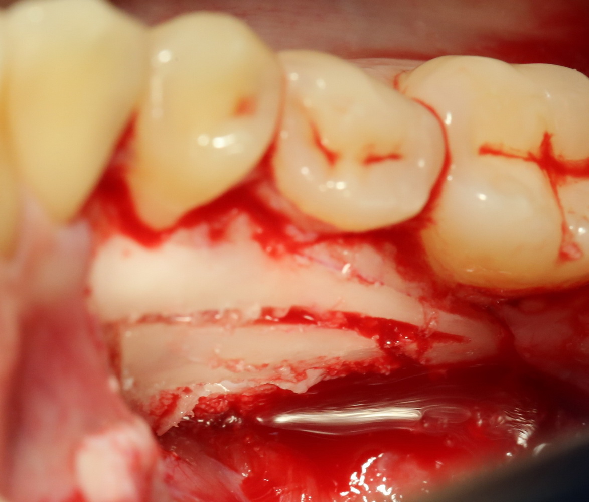 Почему именно костнопластическая? Почему нельзя просто «выпилить» окошко нужной формы? Анализируя КТ, я определил толщину кортикального слоя кости в области операционного доступа и решил, что будет правильнее, сначала, выпилить небольшую костную дверцу, которую после удаления зубов можно поставить на место. Это позволит избежать использования любых барьерных мембран и спейсеров.