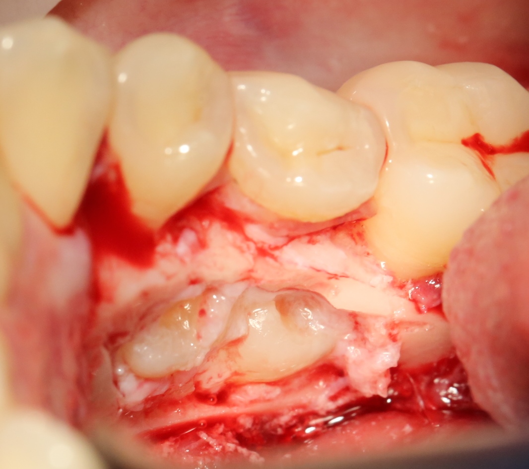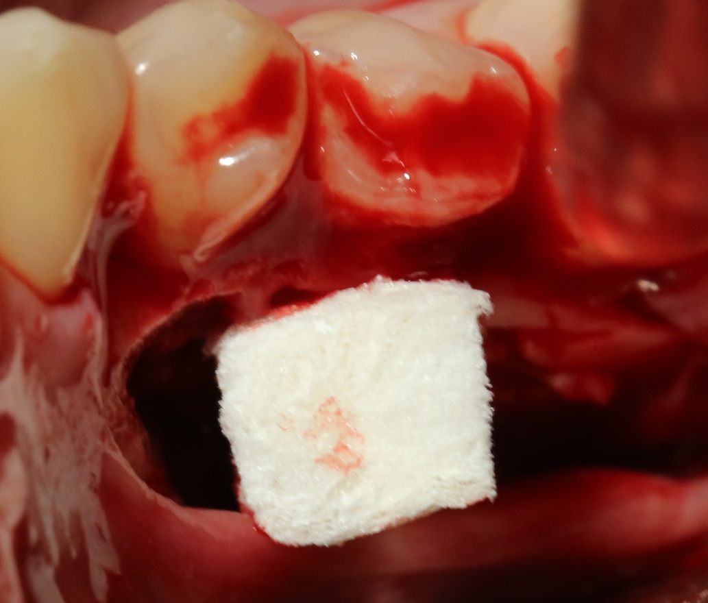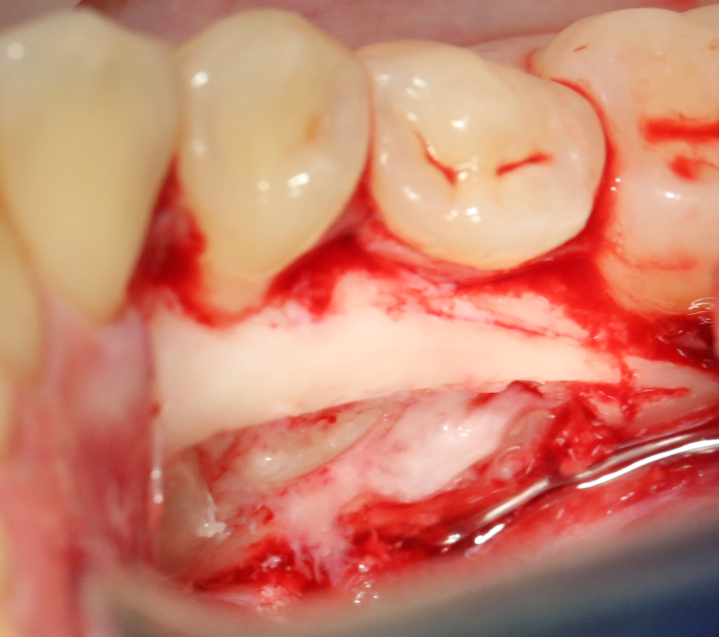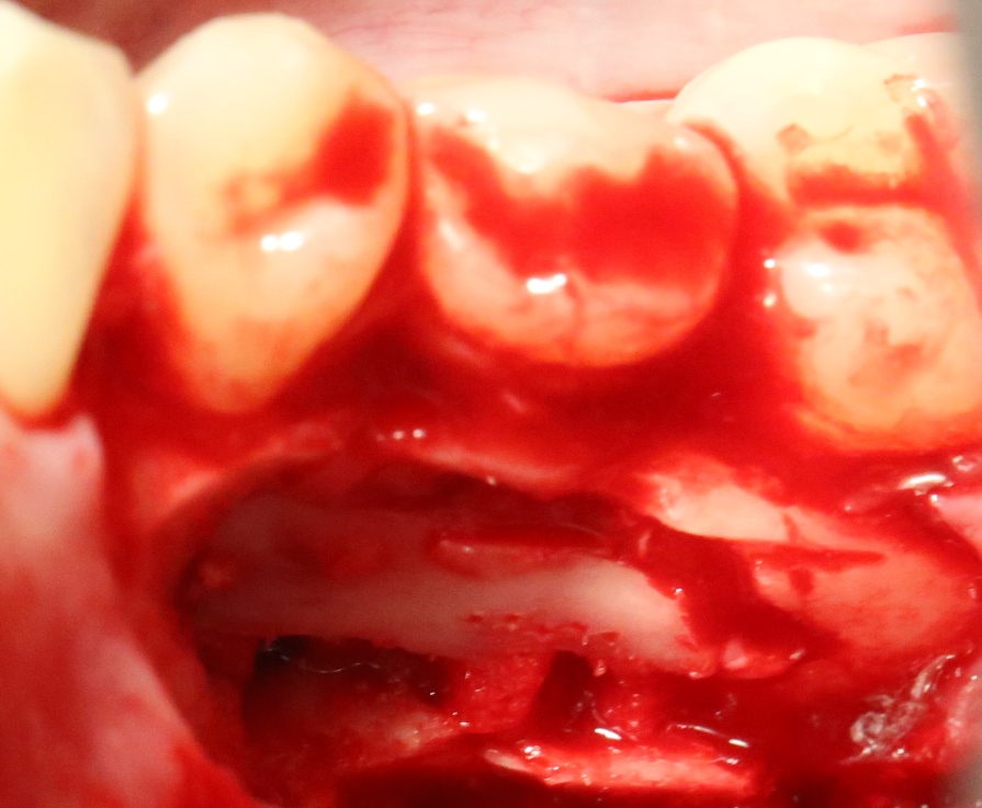 В данном случае я использовал обычную коллагеновую губку — и то, только для того, чтобы «костная дверца», которую я выпилил в самом начале операции, не провалилась внутрь: