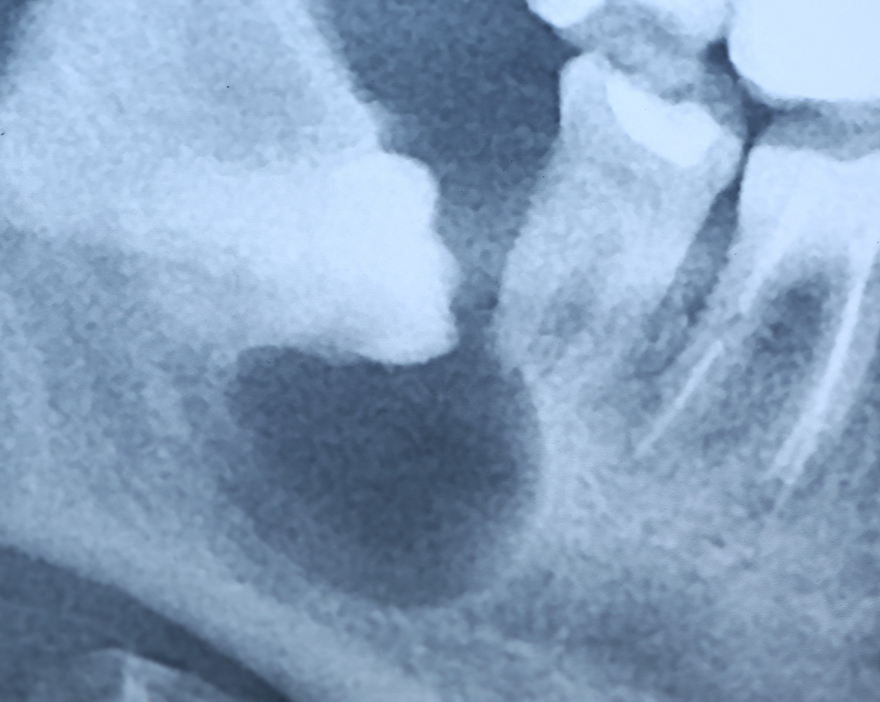 И что мы видим? Под зубом образовалась гигантских размеров фолликулярная киста. То есть, теперь нам нужно не только удалять ретинированный зуб мудрости, но и фолликулярную кисту. А для этого, кстати, придется депульпировать соседний седьмой зуб: