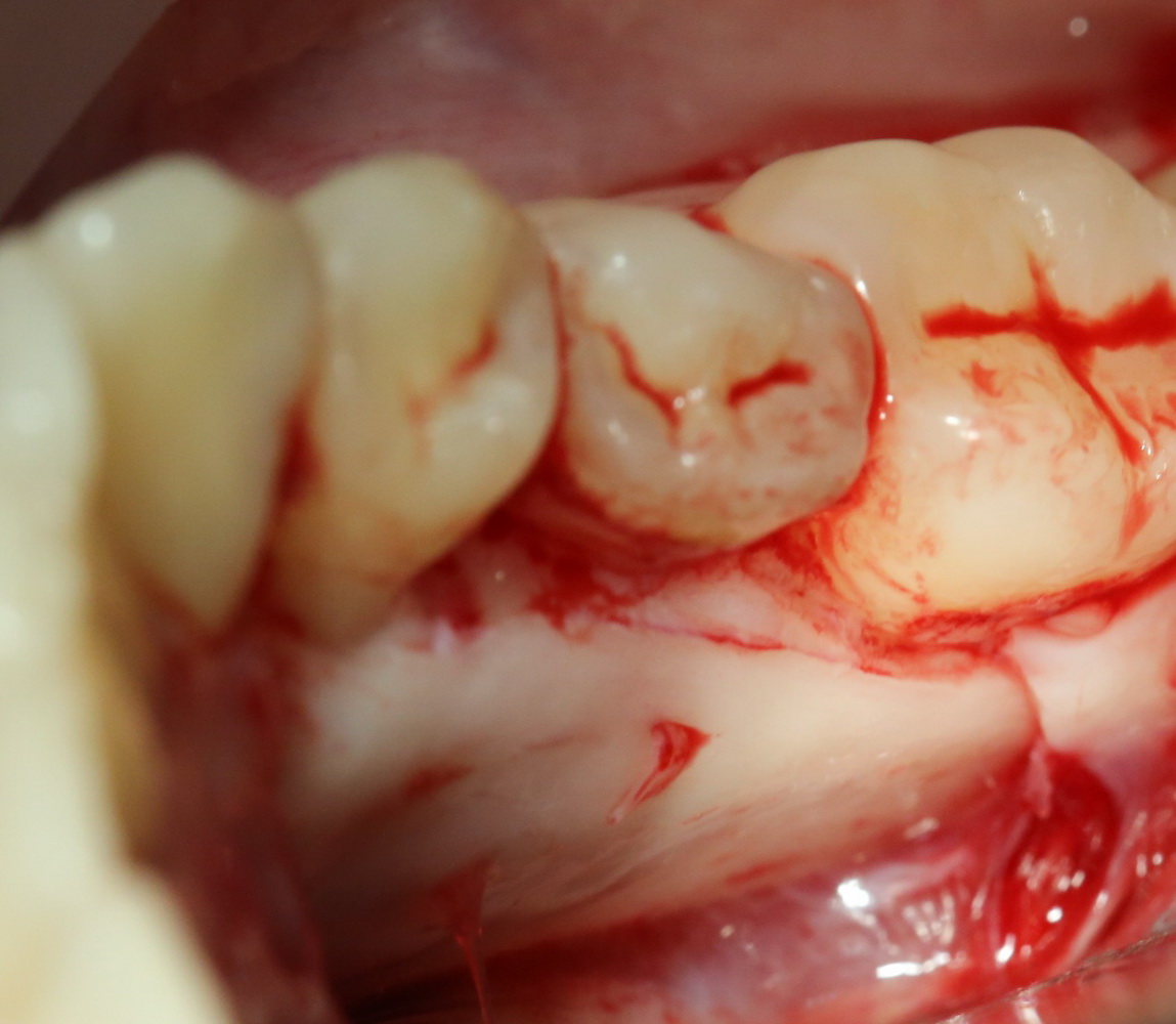 Следует учесть, что с язычной стороны слизистая оболочка более нежная и тонкая. Скелетировать альвеолярный отросток нужно с большой осторожностью: