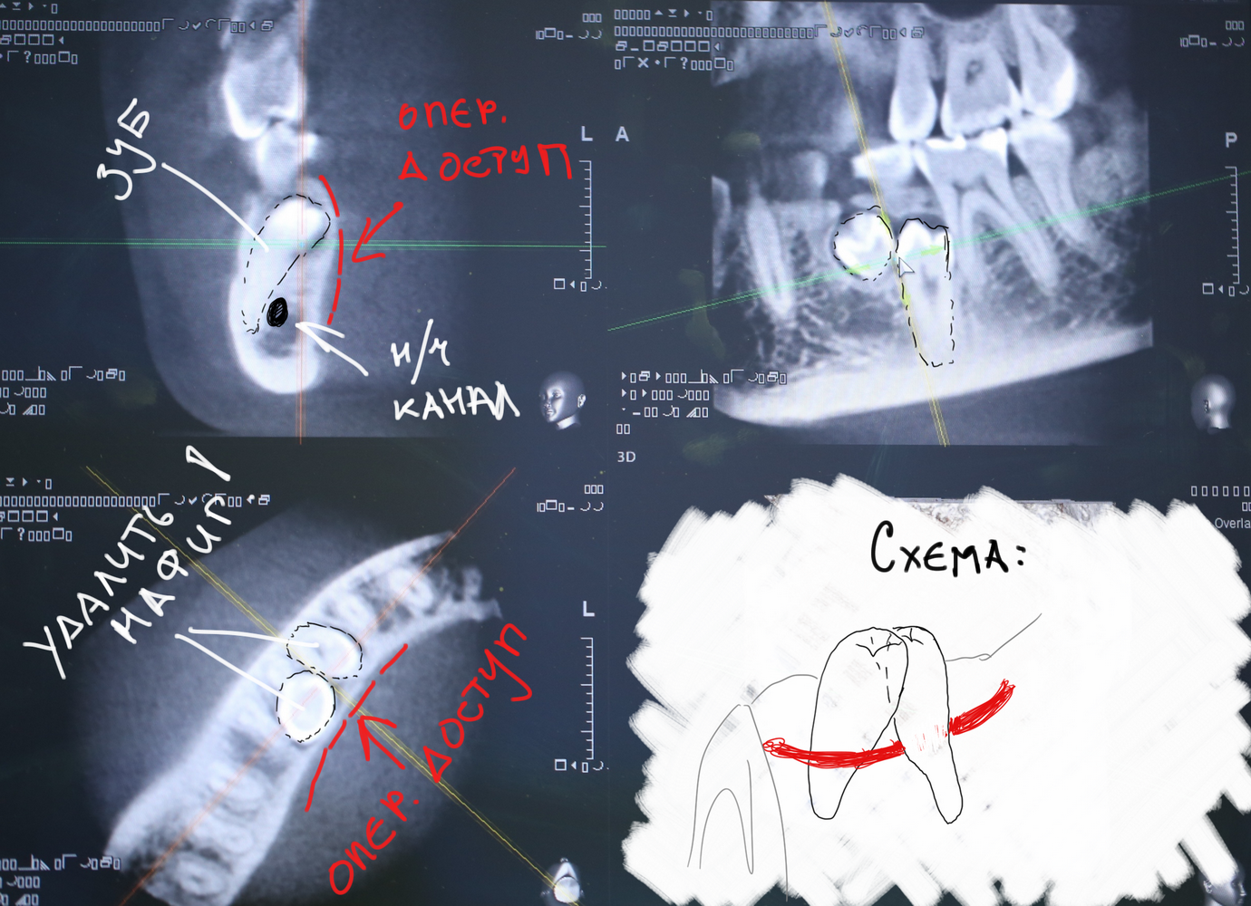 По-моему, на скриншоте всё понятно. Зубы, которые нужно удалить нафиг, обозначены белой стрелкой и словосочетанием «удалить нафиг!«. Темным пунктиром обозначены контуры зубов. Черная точка — просвет нижнечелюстного канала. Снизу слева я попытался наглядно показать схему взаимного расположения и отношения сверхкомплектных зубов к нижнечелюстному каналу. Ну и, внимательно изучив КТ, я принял решение, что операционный доступ нужно делать с язычной стороны.