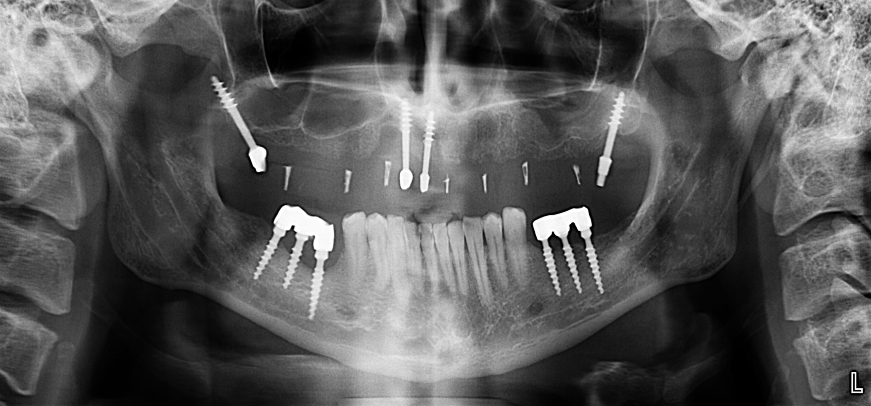 из восьми верхних имплантов осталось четыре, мы их пока используем для стабилизации временного съемного протеза. На то время, пока проводим остеопластику и имплантацию в боковых участках.