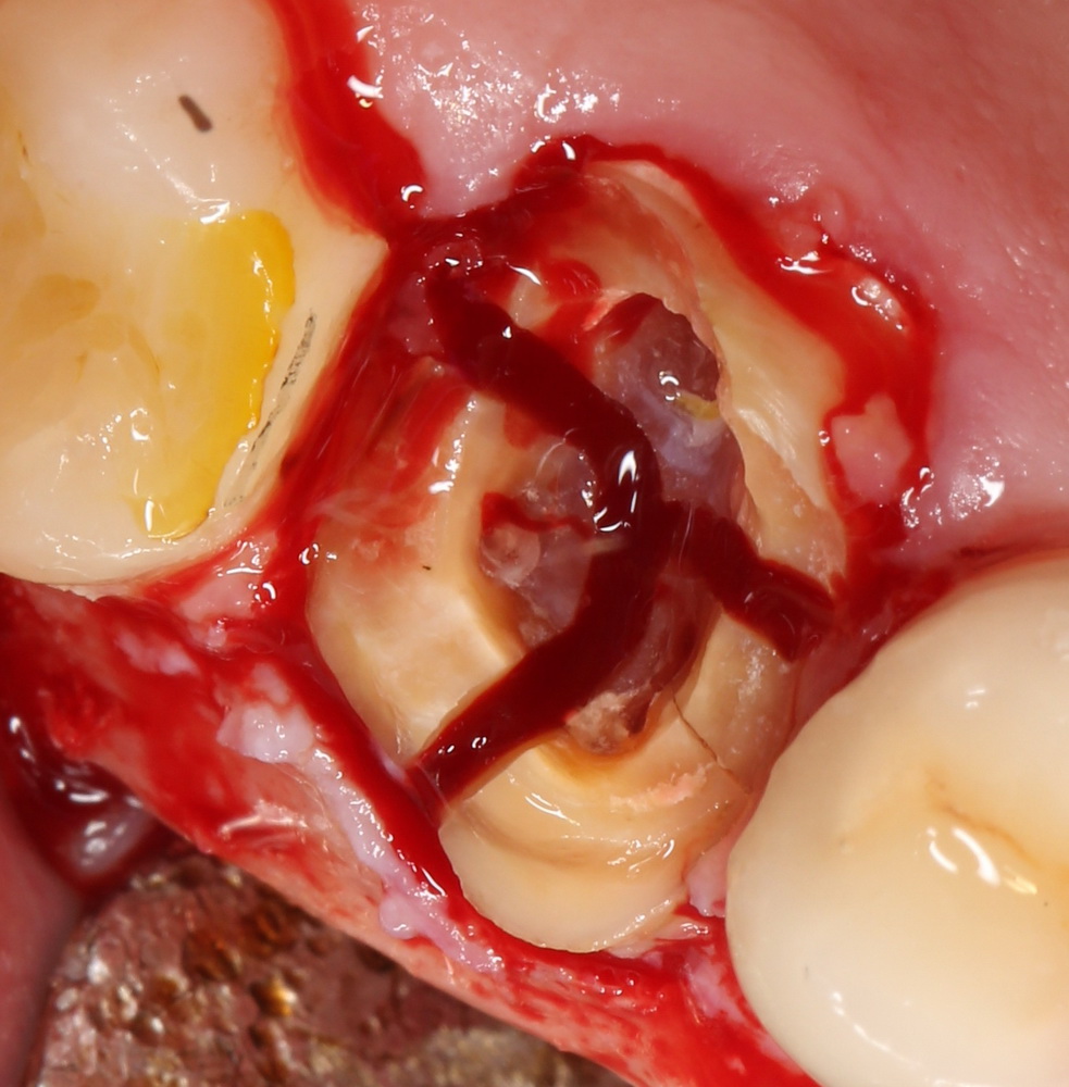 Далее — разрез. Он всегда более обширный, нежели при обычном удалении зубов, поскольку слизистую для ушивания лунки нужно мобилизовать. Намного удобнее проводить разрезы и формировать лоскуты до удаления корней зубов, сразу после «отпиливания» коронковых частей».