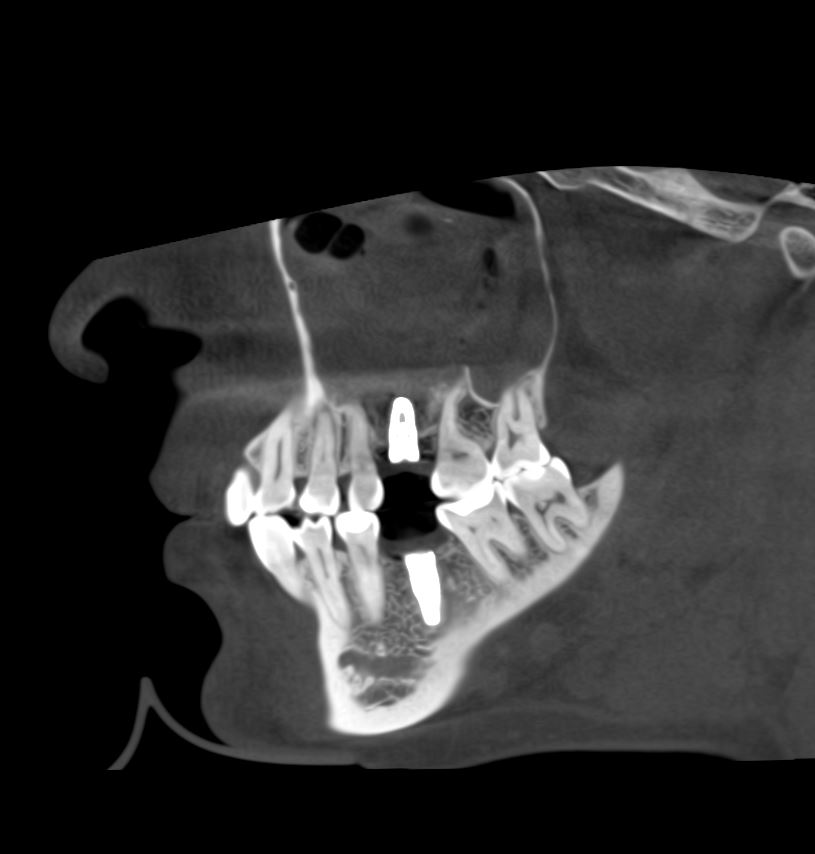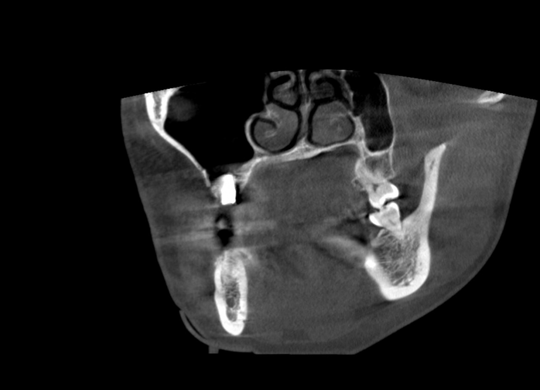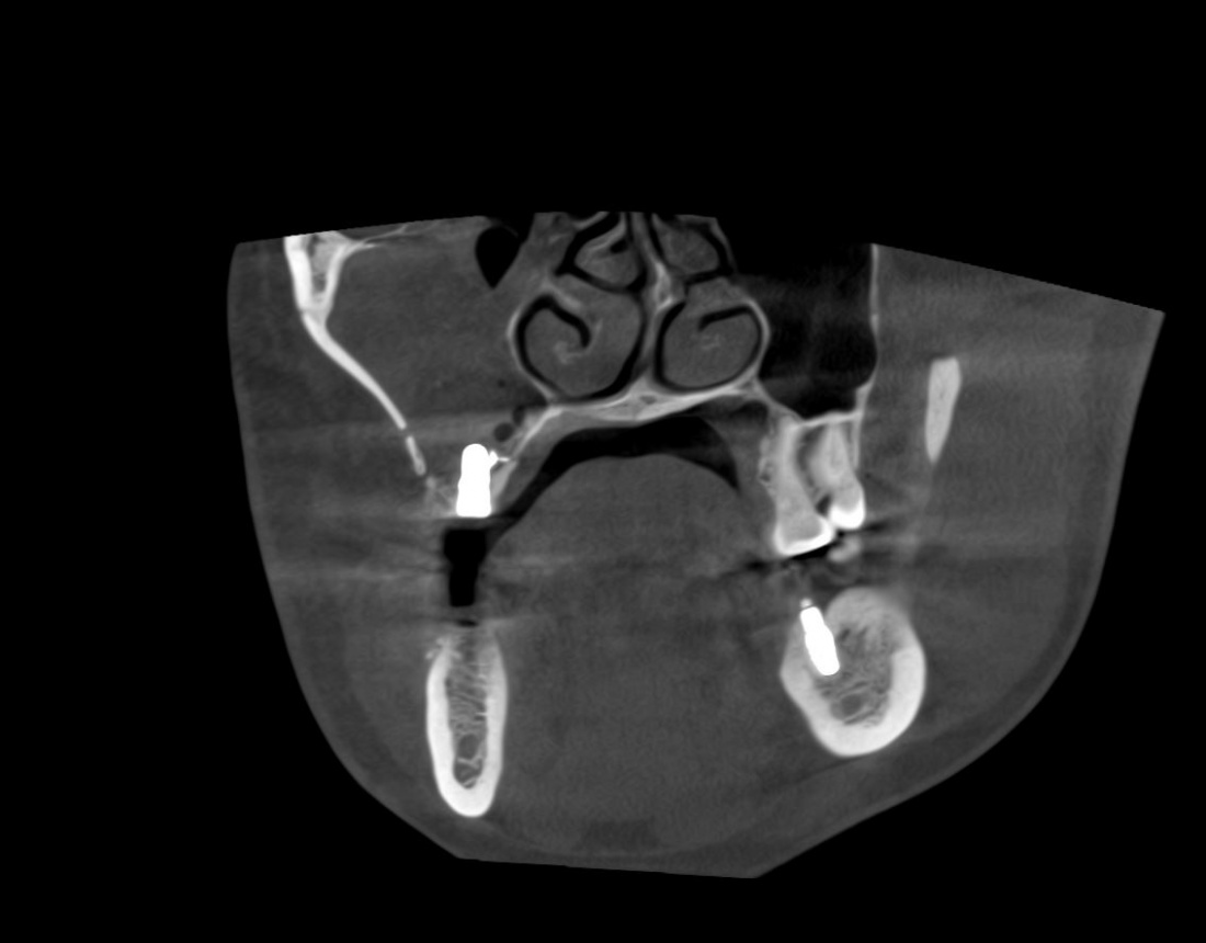 Кстати, обрати внимание на ширину альвеолярного гребня (левая картинка). Она чуть меньше 3 мм. Это объясняет, почему я засомневался в возможности установки имплантатов одновременно с остеопластикой. Понятно и без КЛКТ.