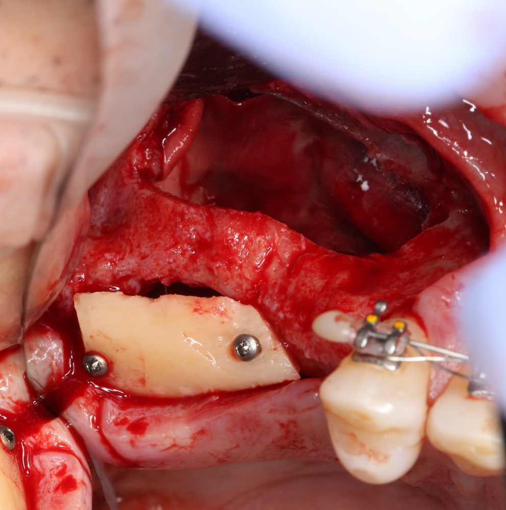 Я зафиксировал костный блок практически без адаптации на несколько винтов. Обрати внимание, что винты находятся в зоне, где не планируется установка имплантатов. Фиксация должна быть надежной, поскольку мне еще предстояла подготовка лунок для имплантатов. Трех винтов для этого вполне достаточно.
