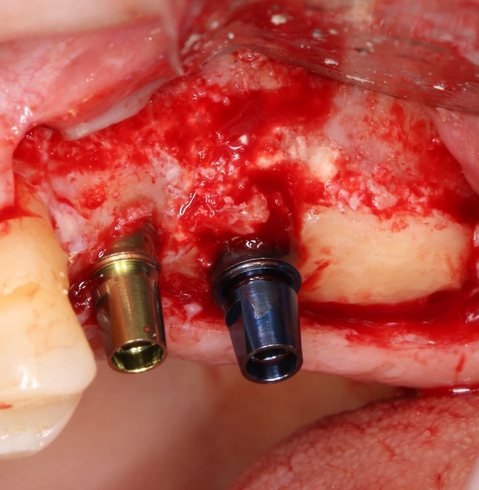 Безусловно, субгингивальные имплантаты удобнее во всех отношениях, но… после остеопластики сложно спрогнозировать уровень атрофии кости в послеоперационном участке и угадать с правильным положением платформы. К тому моменту у меня уже был опыт подобных операций, в т. ч. с субгингивальными имплантатами, но не при такой конфигурации альвеолярного гребня и не при таком объемном костном дефекте.