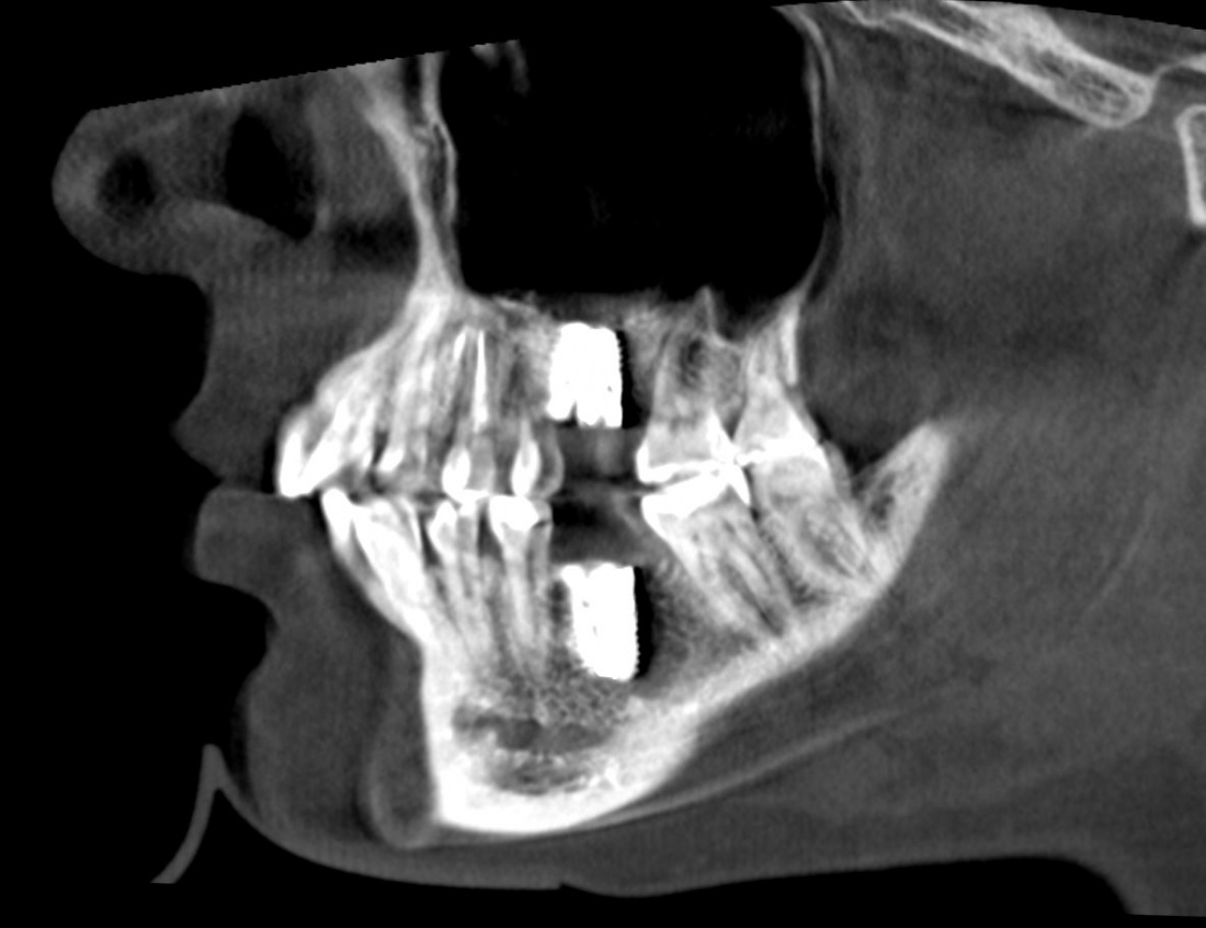 Остеотомия пролетает сразу, поскольку альвеолярный гребень такой ширины невозможно расщепить так, чтобы правильно установить имплантаты. Технически — да, но тогда имплантаты будут расположены слишком язычно, плюс риск атрофии тонкого вестибулярного фрагмента… Короче, не от случай для остеотомии.