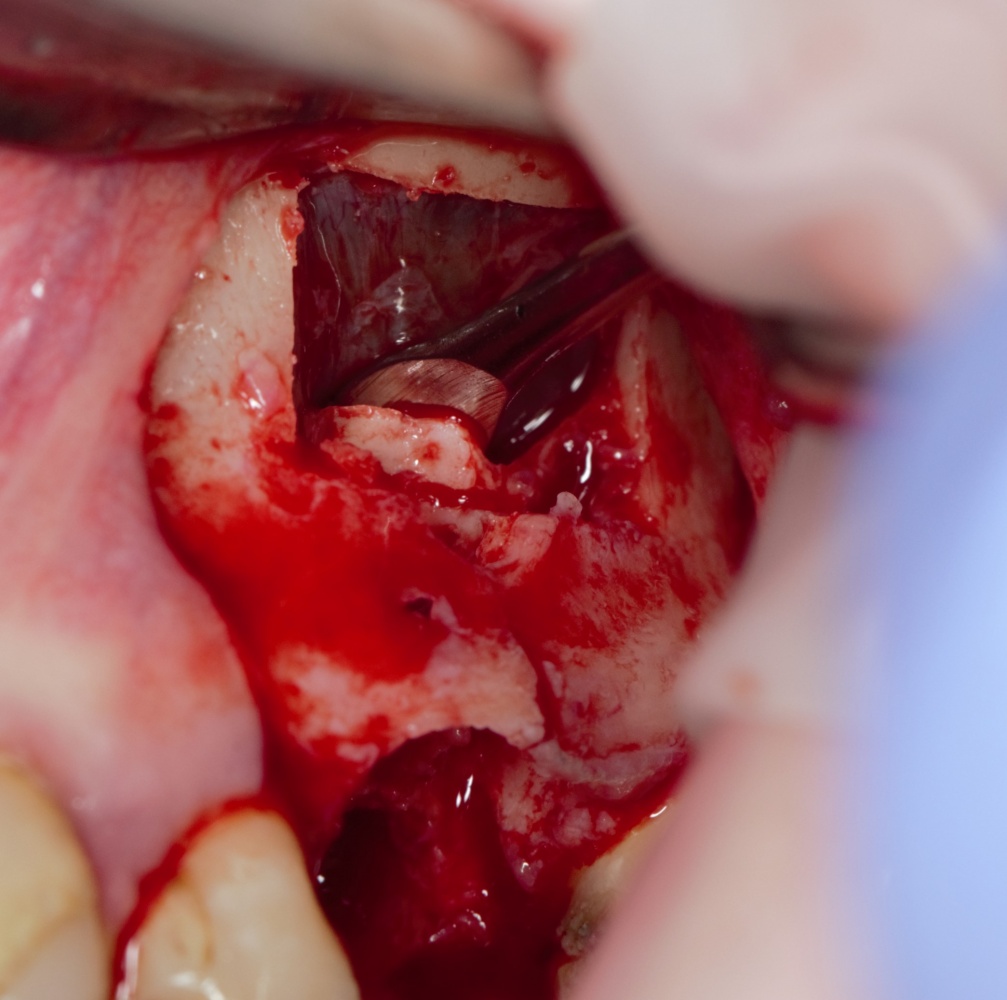 Для получения костного блока мы использовали ультразвуковую пьезохирургическую систему. Это самый удобный и безопасный инструмент для проведения подобных манипуляций. С помощью него мы сформировали и выделили костный блок. Он должен отделяться легким движением остеотома или элеватора. Как это сделать правильно — читай здесь>>