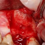 — я использовал барьерную мембрану Geistlich Bio-Gide, которая имеет две разные поверхности: с одной стороны она рыхлая «адгезивная», с другой — гладкая и прочная. Как укладывать — на результат не влияет, но в плане удобства рыхлую поверхность мы «приклеиваем» к тому, на чем требуется барьерную мембрану удержать. В данном случае хотелось бы удержать её на костной поверхности — следовательно, мы укладываем её рыхлой поверхностью к кости.