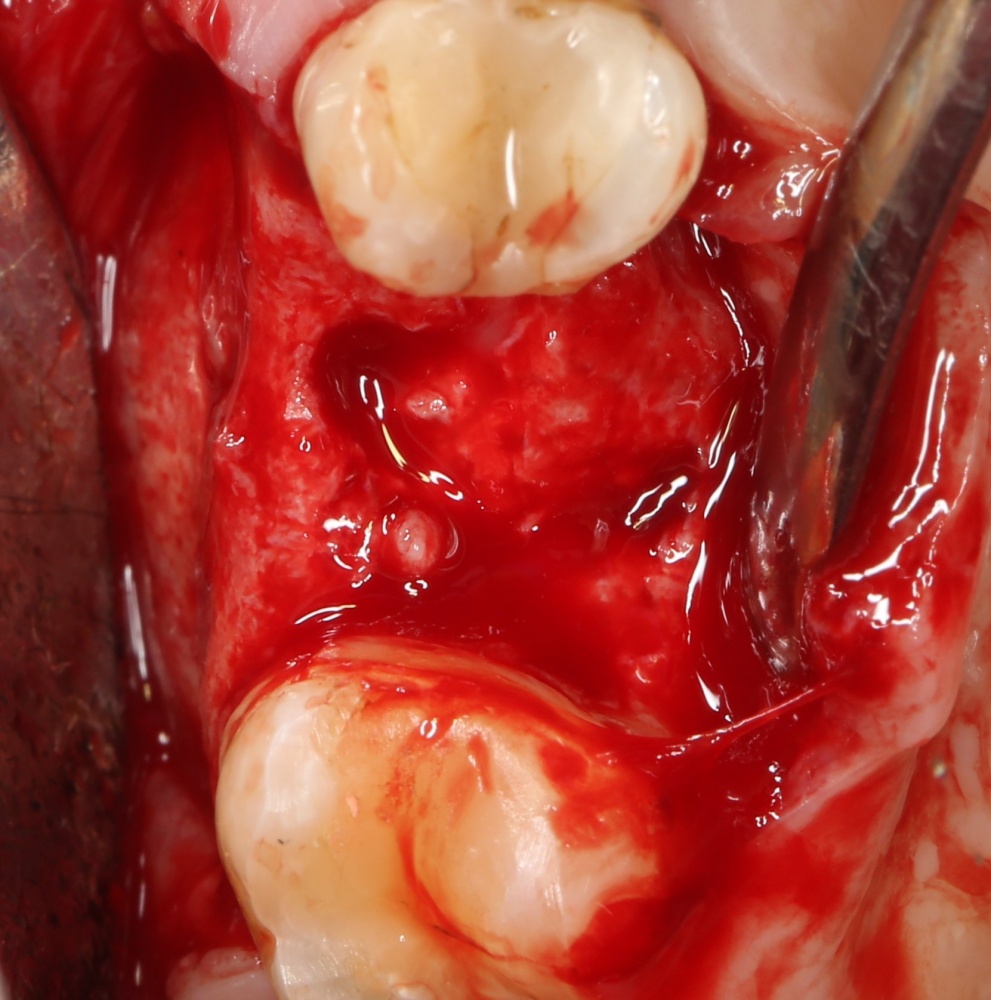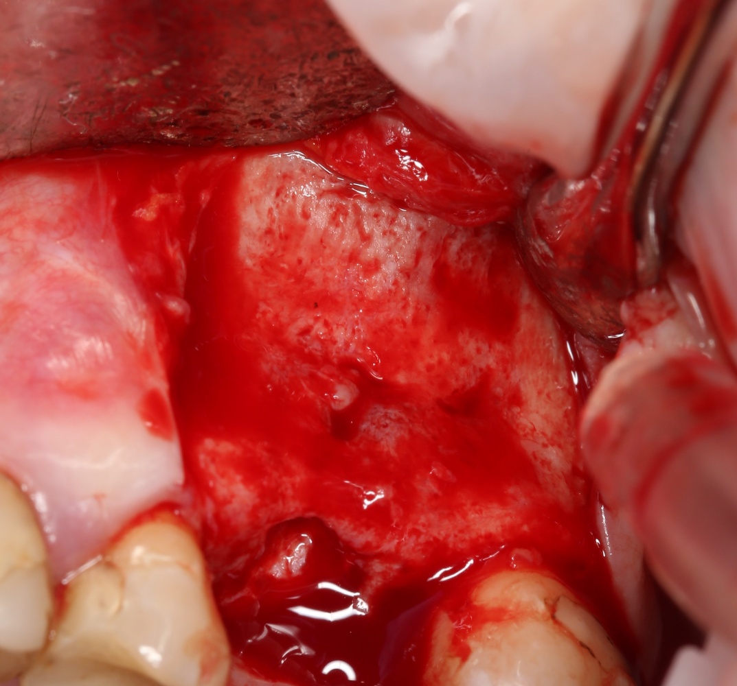 Конкретно в этом клиническом случае между костным аутотрансплантатом, ложем и имплантатами есть пустое пространство. Если его не изолировать от мягких тканей, они прорастут и осложнят интеграцию аутографта. Поэтому я решил перекрыть костный блок барьерной мембраной, пусть это делает хирургическую операцию немного дороже.