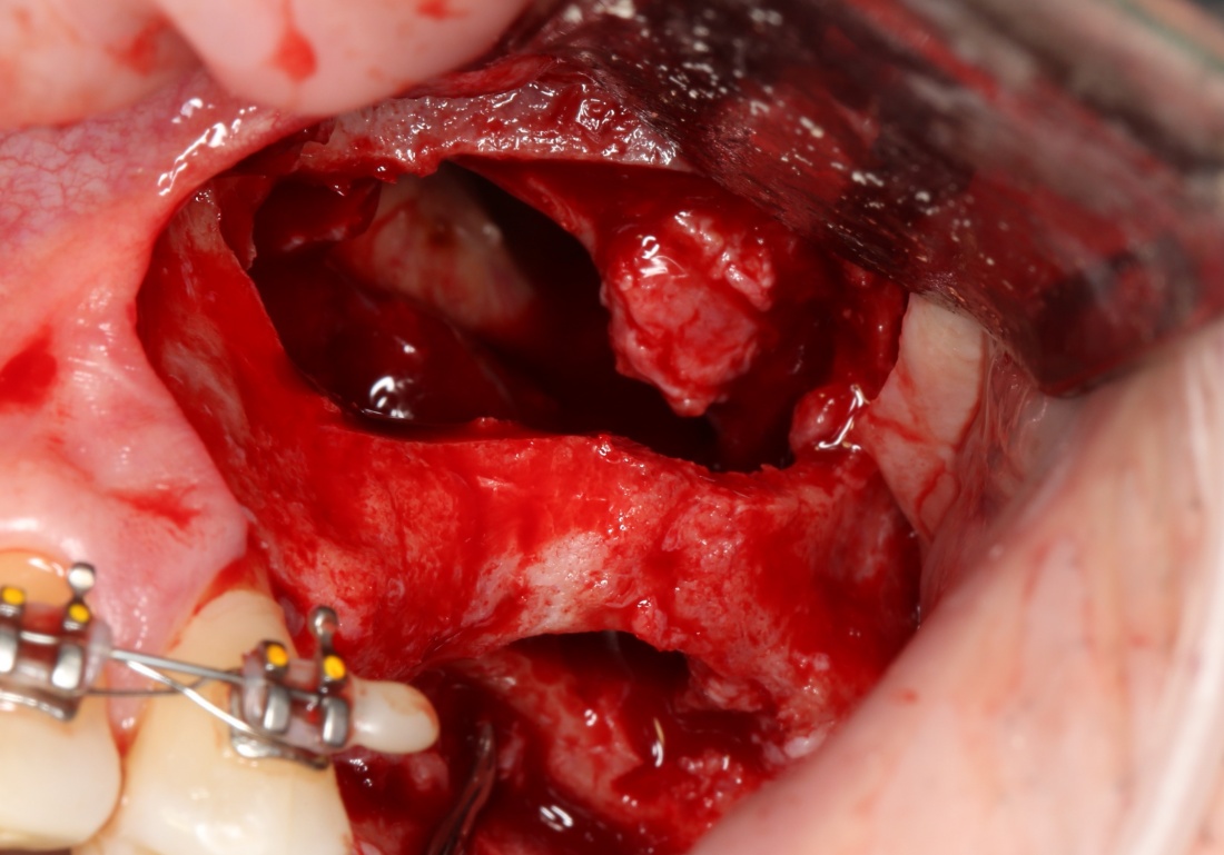 В общем, так и получилось. Уж не помню, почему я наобещал пациентке, что мы поставим ей имплантаты одновременно с остеопластикой. Но я наобещал. И, когда увидел клиническую картину в полости рта: