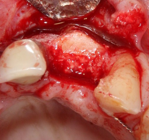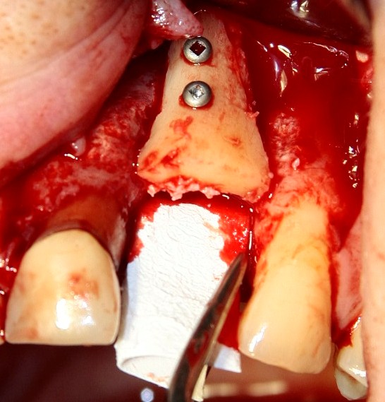 2. Под блоком, вероятно, будет небольшое пустое пространство вследствие неплотного соответствия поверхностей. Его заполняем аутокостной стружкой, взятой из того же участка, что и блок. В этом случае использование барьерной мембраны (BioGide, Jacon и т. д.) ОБЯЗАТЕЛЬНО.