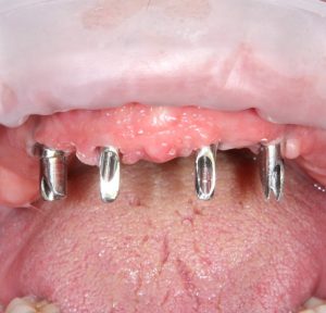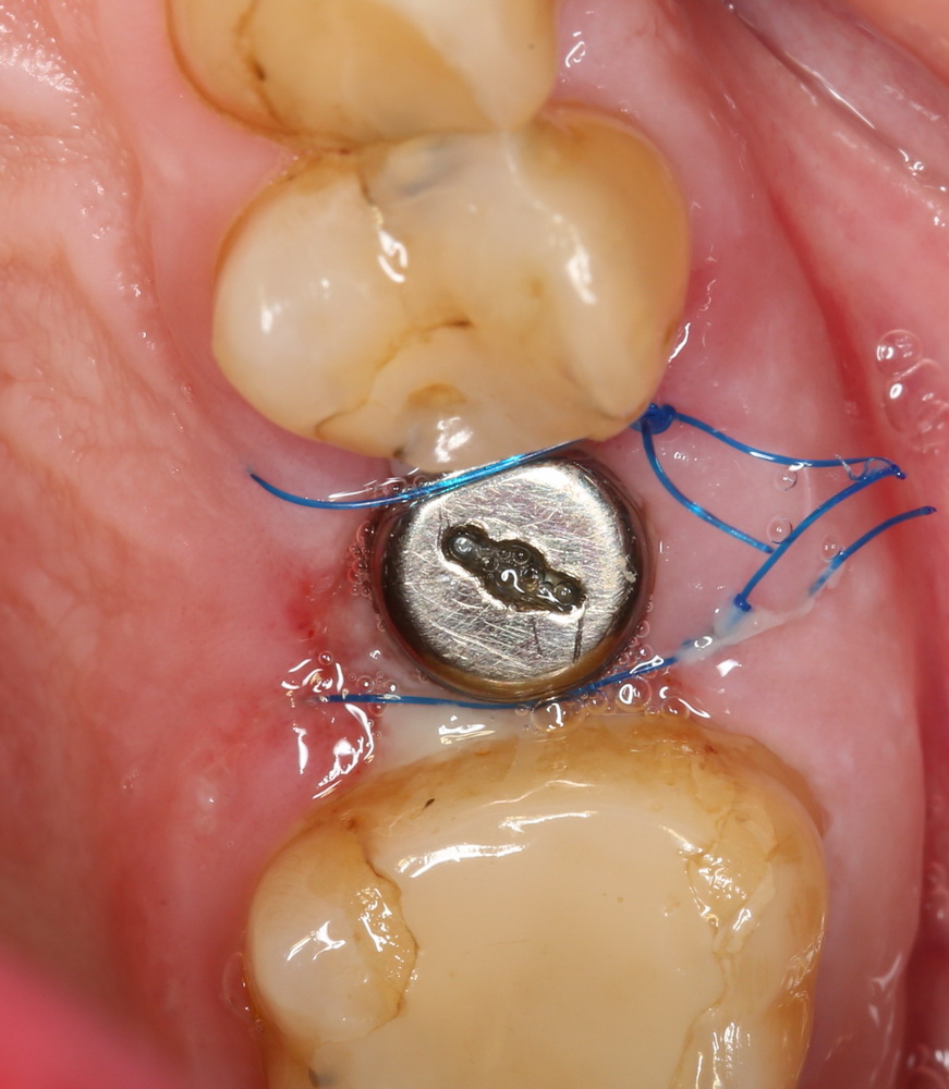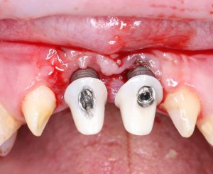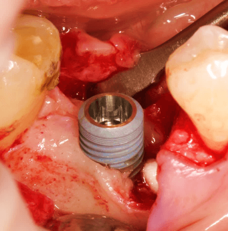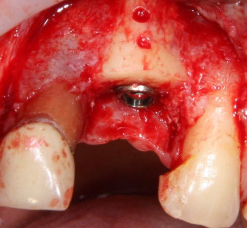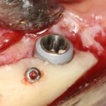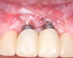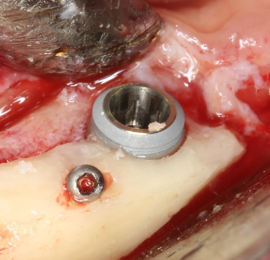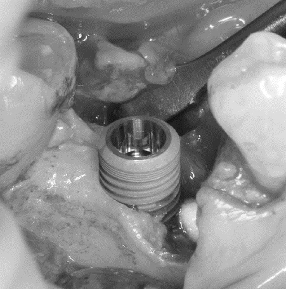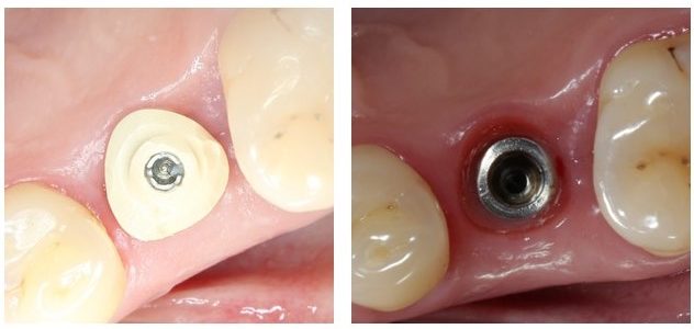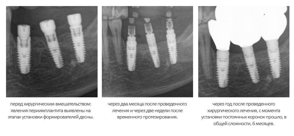 Помимо этого, один из этапов лечения периимплантита предполагает «превращение» субгингивального имплантата в трансгингивальный (подробности здесь>>). Описанную в статье методику можно считать успешной —  она, пусть и не восстанавливает уровень костной ткани вокруг имплантатов, но помогает избежать развития заболевания и потери имплантатов вообще: