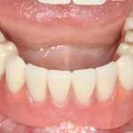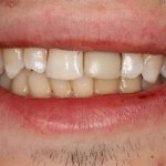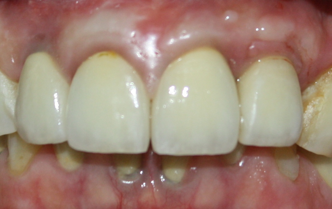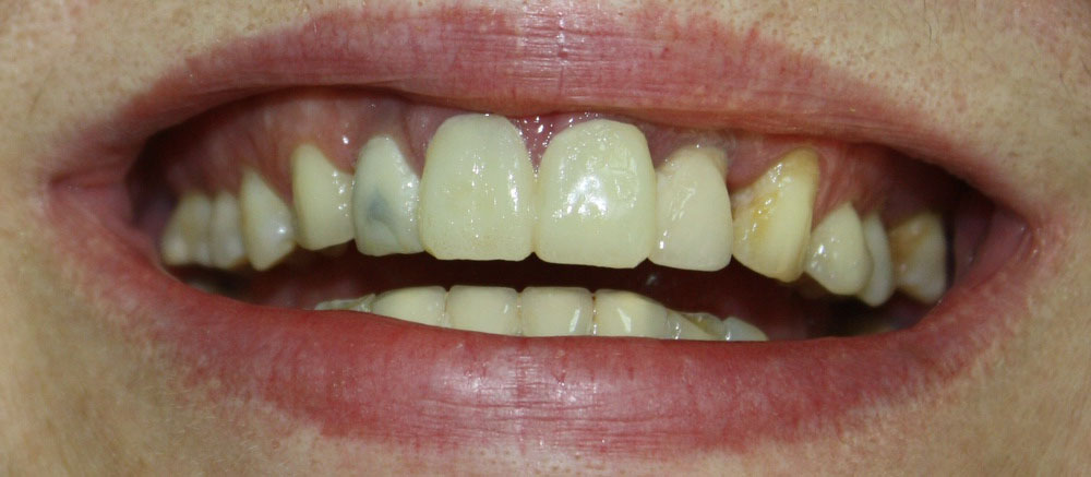 Пару слов об ортодонтии в данной ситуации. Раньше (да и сейчас) некоторые доктора решали вопрос «выдвижения» отдельных зубов очень просто: их депульпировали, стачивали до нужного уровня и покрывали коронками. Но подумайте — согласились бы вы покрыть коронками нормальные, в общем-то, зубы? Я — ни за что. Поэтому я приглашаю ортодонта (в нашей клинике есть замечательный доктор Слива Виктория), мы планируем с ней ортодонтическое лечение: на данный сегмент зубного ряда будут наклеены брекеты, затем, с помощью микровинтов (кортикальная опора), мы проведем интрузию («втягивание») данных зубов в правильное положение. Это займет несколько месяцев, как раз до этапа протезирования.
