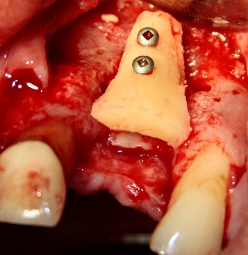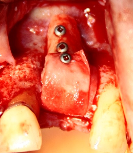 1. Способ проведения операции — аутотрансплантация костного блока из ретромолярной области и ветви нижней челюсти с последующей фиксацией винтами. Это наиболее предсказуемый метод вертикальной остеопластики, дающий максимум положительных результатов. Ни один метод с использованием ксенотрансплантатов (Bioss, Cerabone, Easygraft и т. д.) такой статистики не дает.