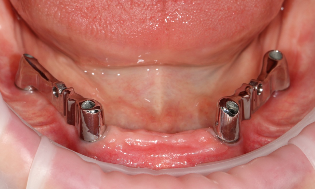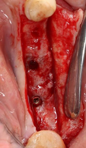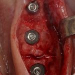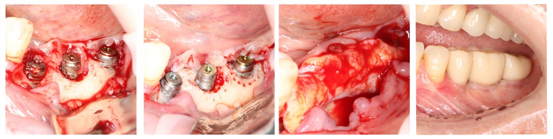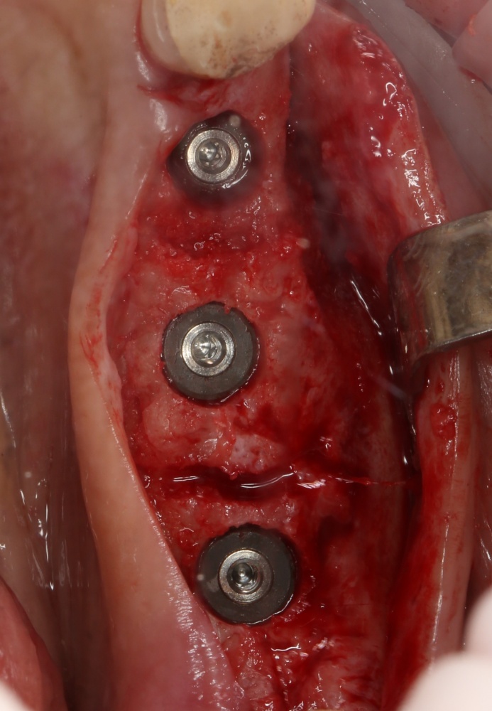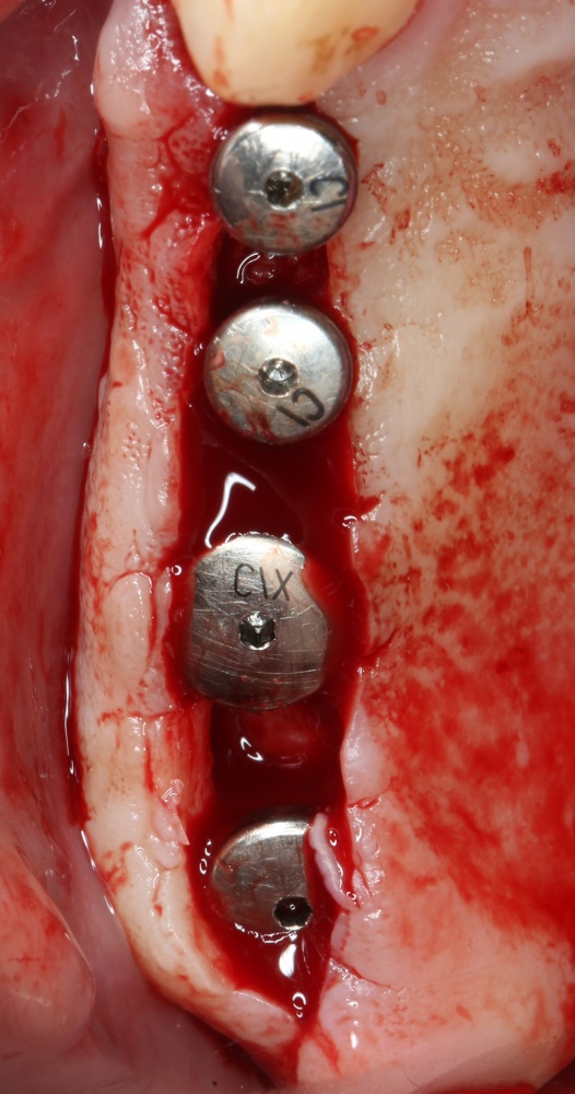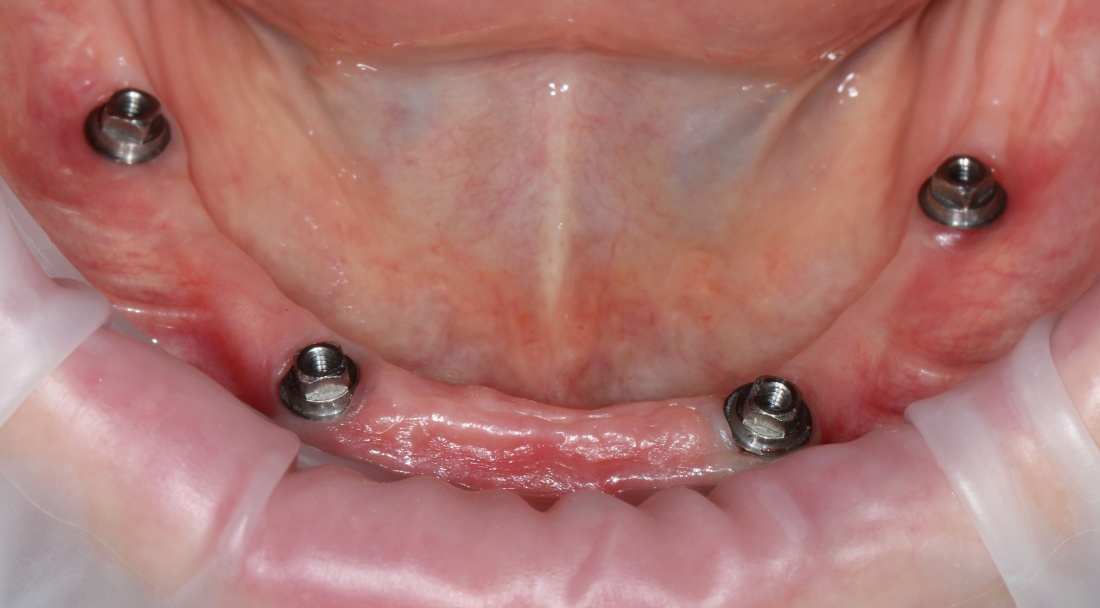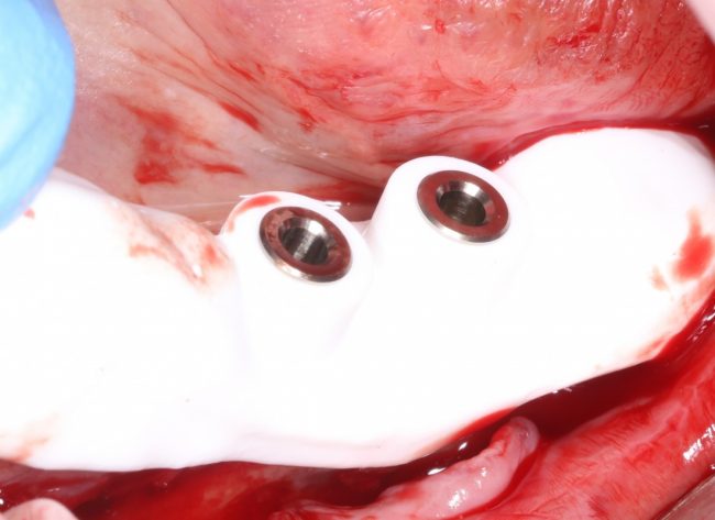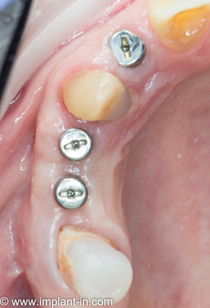Винты, фиксировавшие блок, удалены. Имплантаты позиционированы по разметке ортопеда, исходя из планируемой ортопедической конструкции.