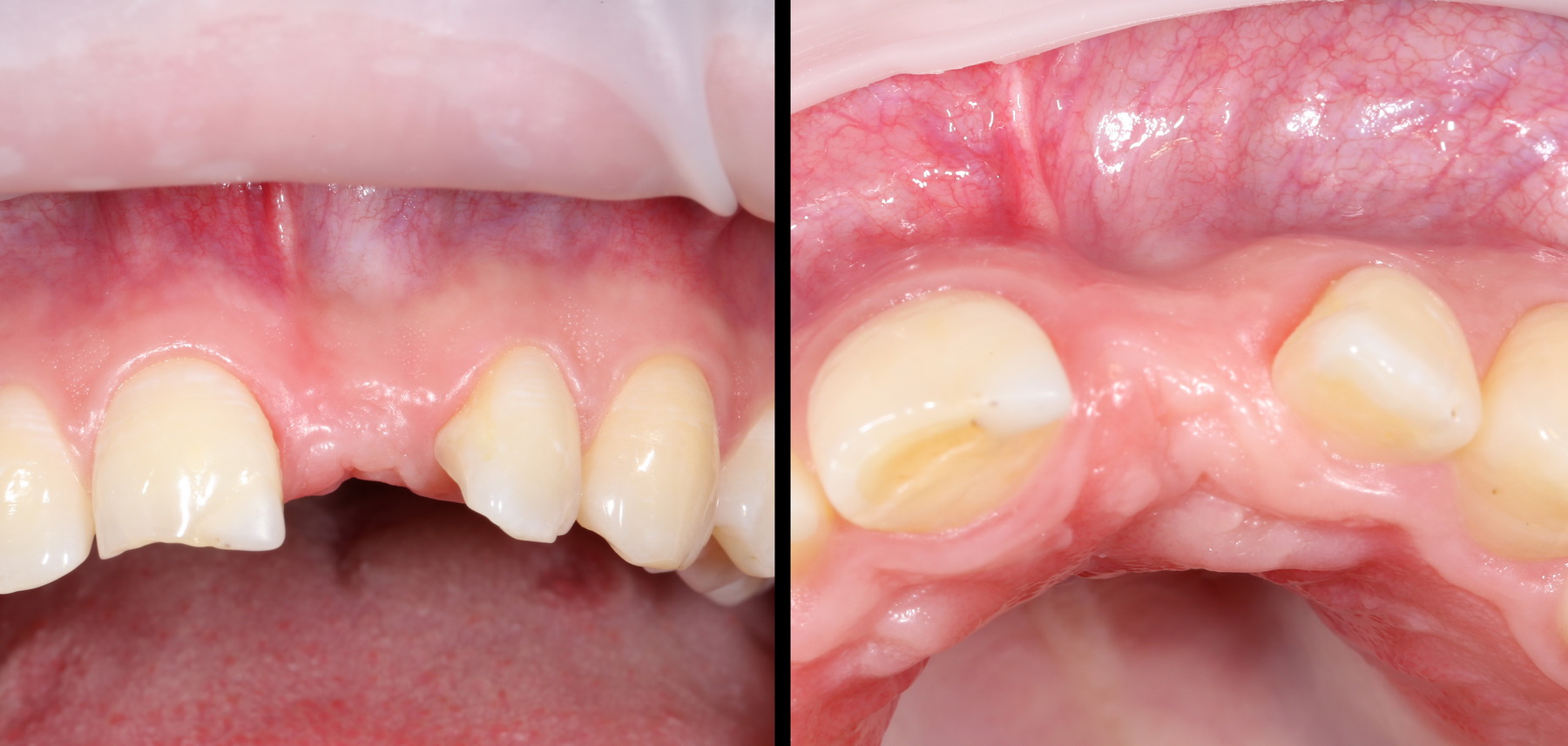 Снимок слева сделан сразу после операции, а справа — через 4 месяца, на этапе установки формирователей десны.