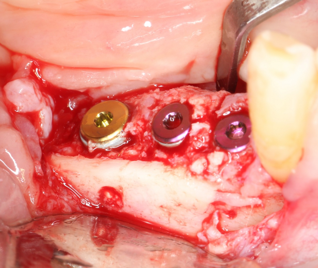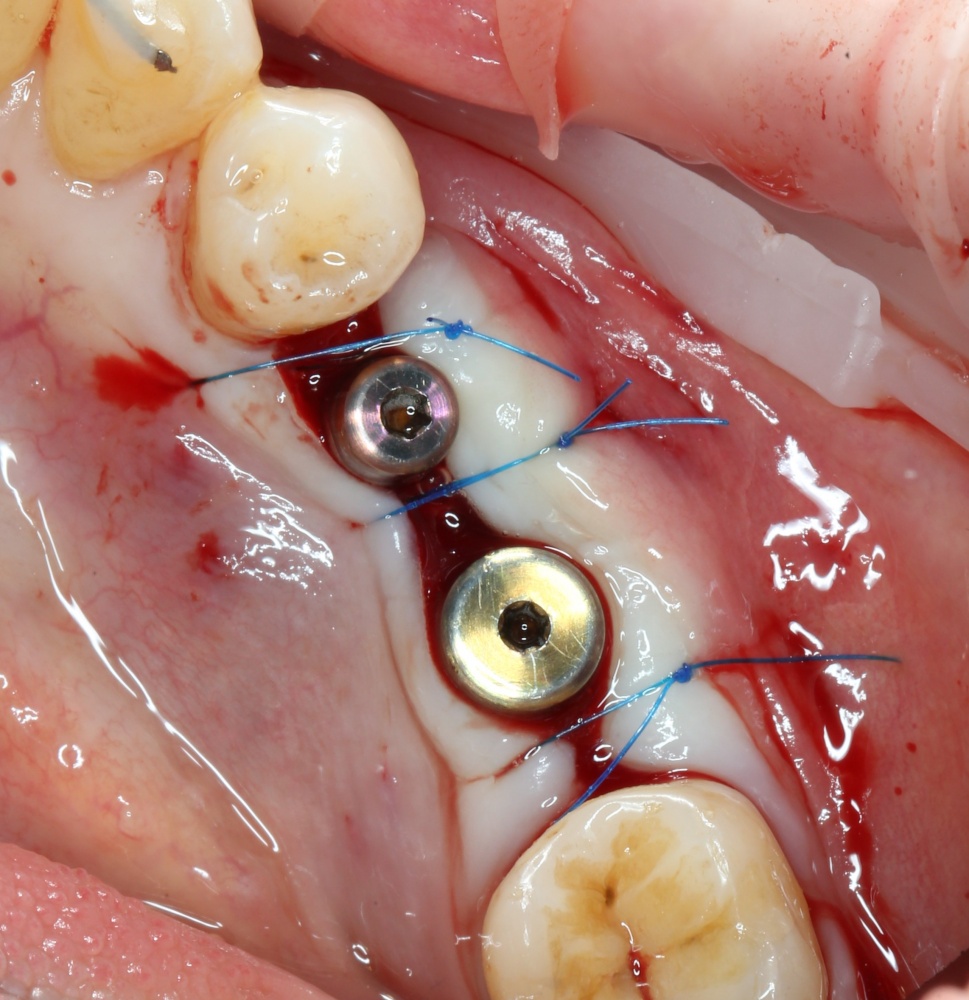 Практически, для проведения операции имплантации одновременно с остеопластикой можно использовать любые импланты. Однако, работа с имплантами, имеющими плоскую ортопедическую платформу (такие, как XiVE Dentsply Implants), несколько сложнее, чем с имплантами, имеющими конический ортопедический интерфейс. Для проведения НКР еще удобнее субкрестальные импланты (к примеру, Ankylos Dentsply Implants), поскольку можно не париться с позиционированием по высоте и просто «утопить» импланты целиком в графт:
