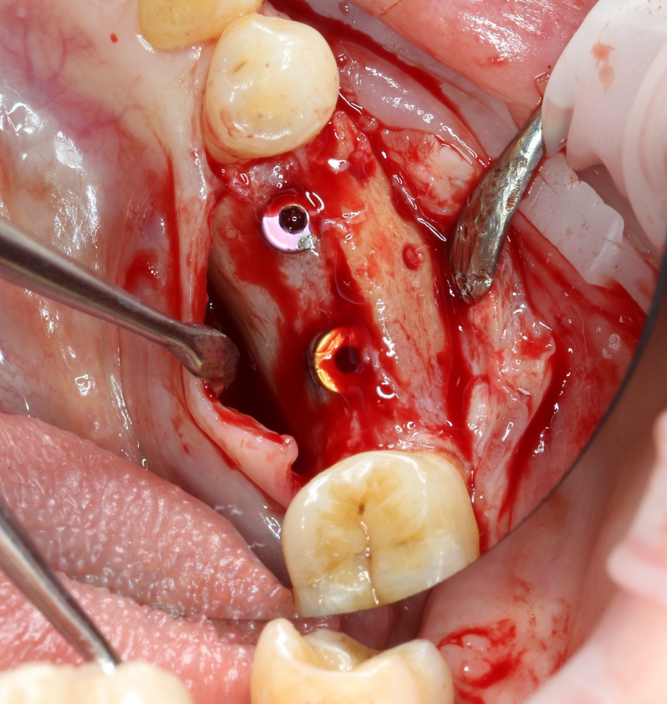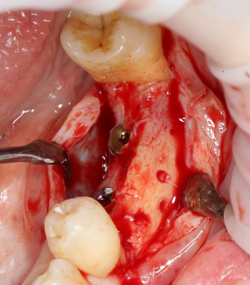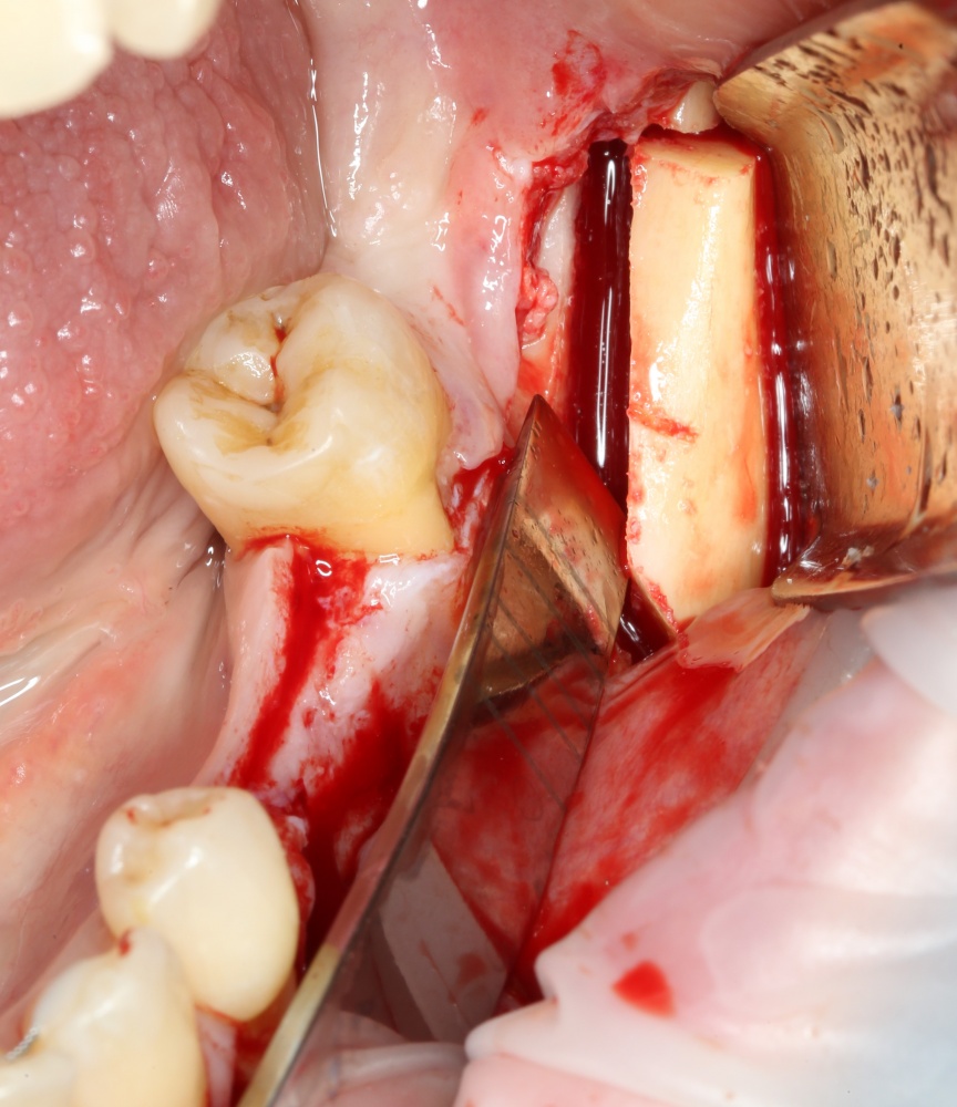 Для начала, нужно определиться с методикой. В данном случае подойдет любой из методов, но совместно с пациенткой мы решили установить импланты и провести одномоментную остеопластику методом аутотрансплантации костного фрагмента. Поэтому стоит подумать о том, чтобы всю операцию провести через одну рану. Это уменьшит травматичность и облегчит уход за областью вмешательства в послеоперационном периоде.
