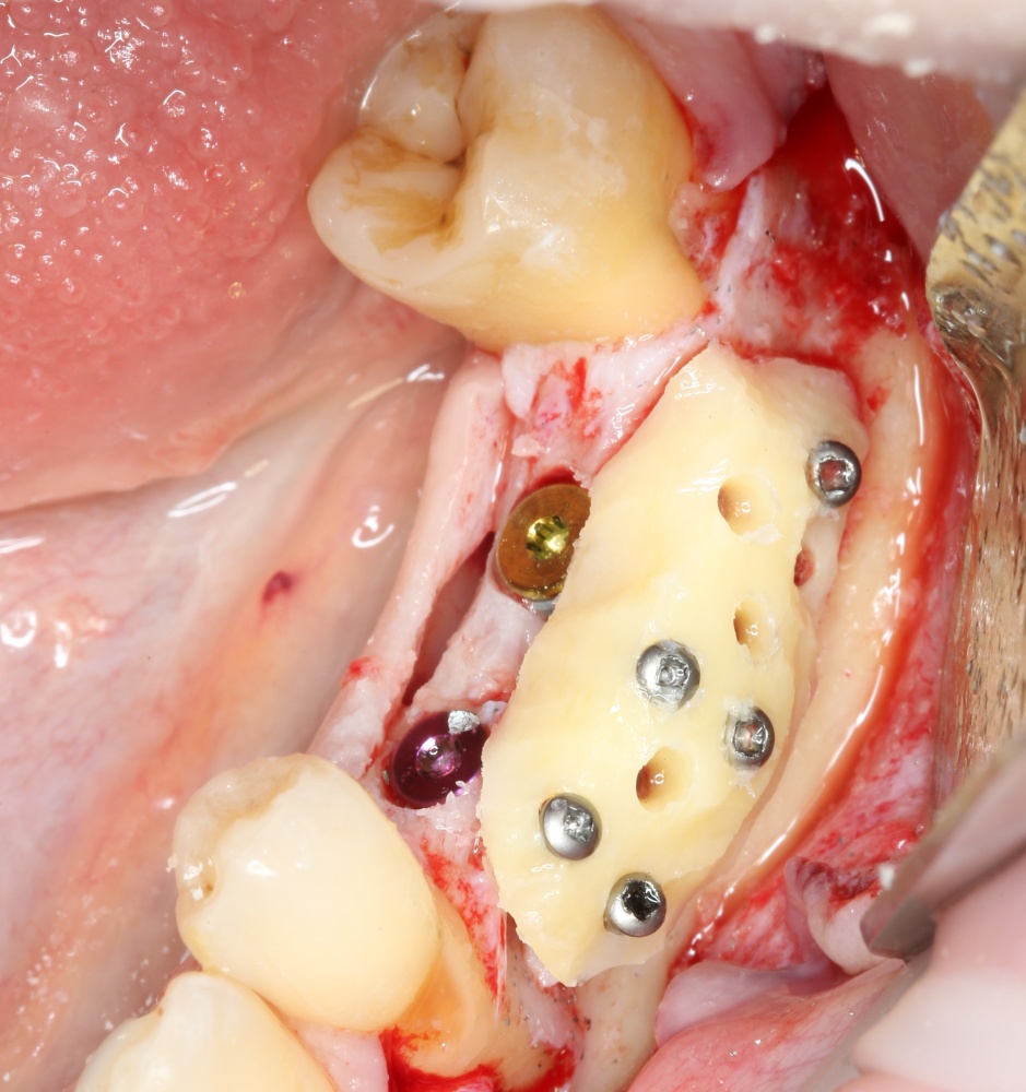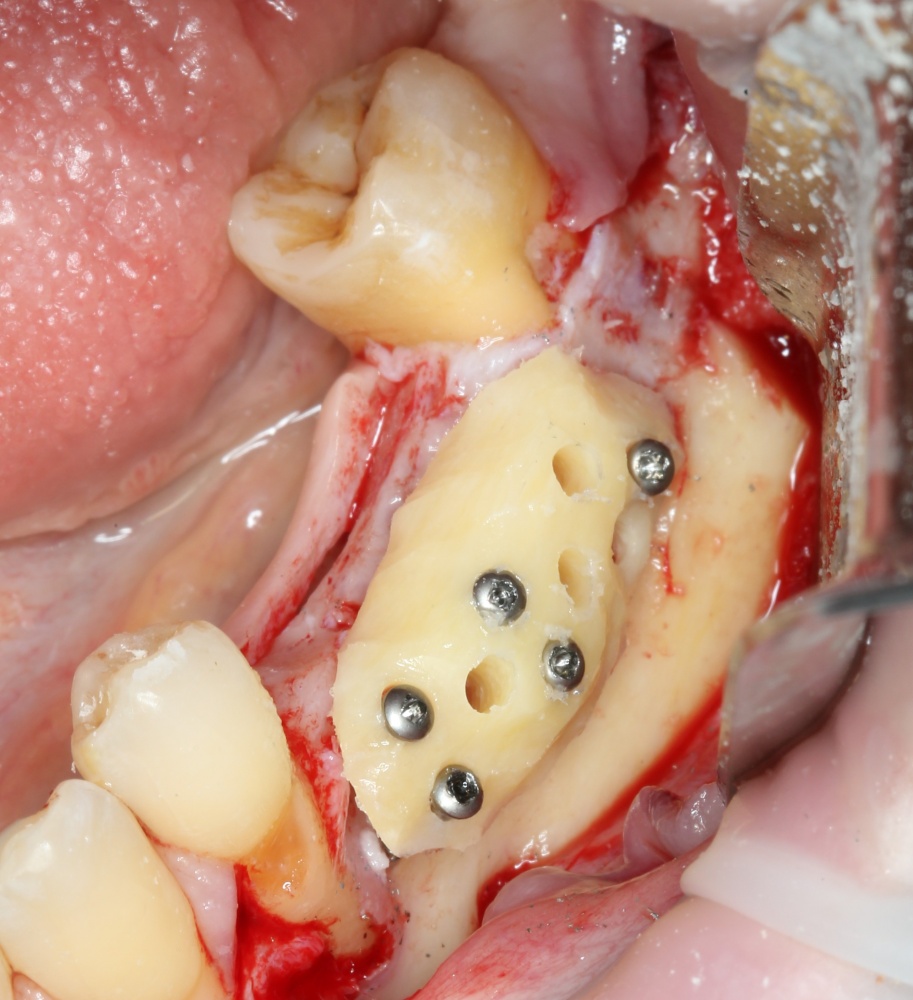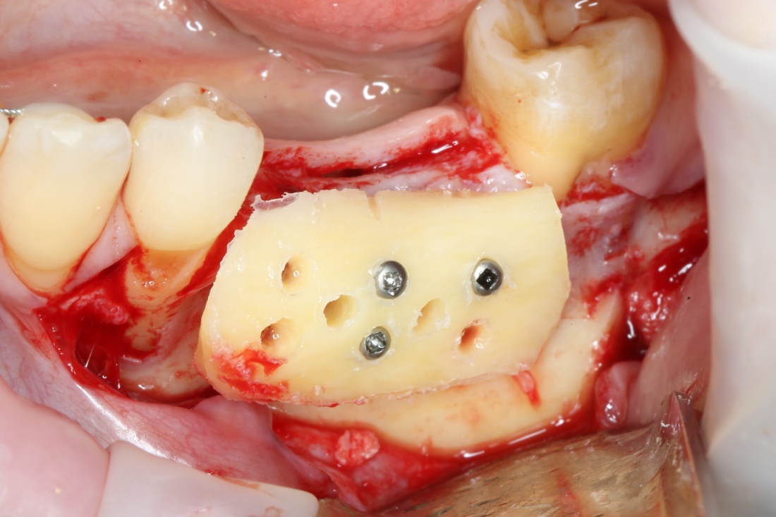 Многие ошибочно предполагают, что большое количество дырок в блоке нужно для того, чтобы «всё лучше срослось». На деле, большое количество отверстий в аутокостном фрагменте даст нам возможность переставлять вины и адаптировать его «на месте». А это особенно важно для одномоментной установки имплантов, потому что винты не должны попасть в проекцию будущей лунки.