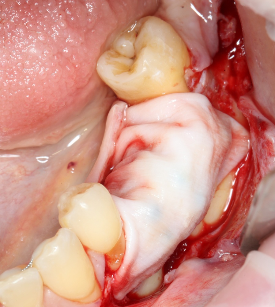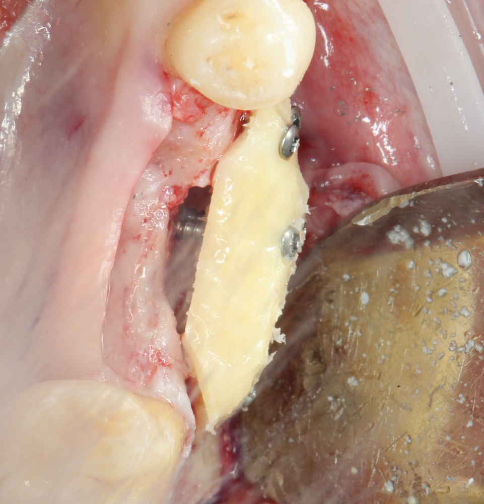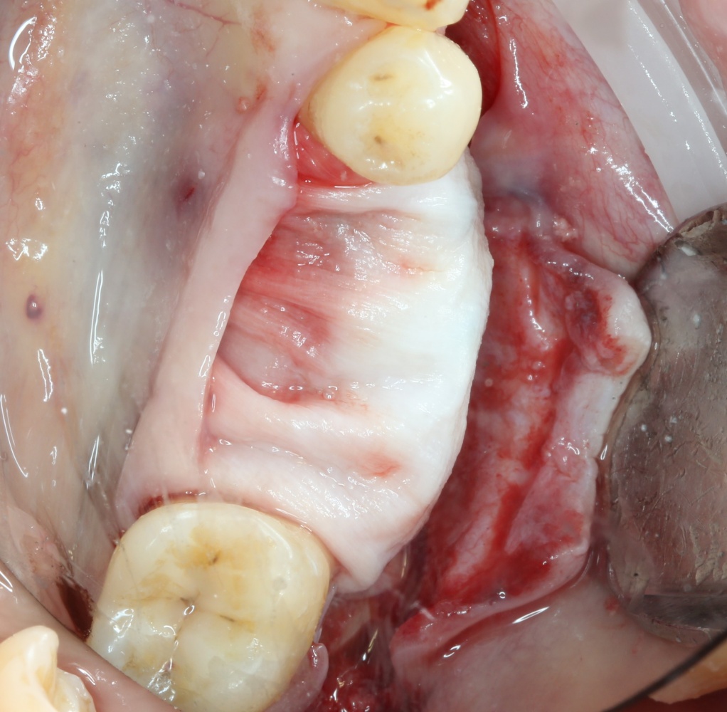 2. Между блоком и принимающим ложем есть пустое пространство. Поэтому область операции необходимо изолировать барьерной мембраной от быстро растущих мягких тканей. Я использую Geistlich BioGide 25×25 mm: