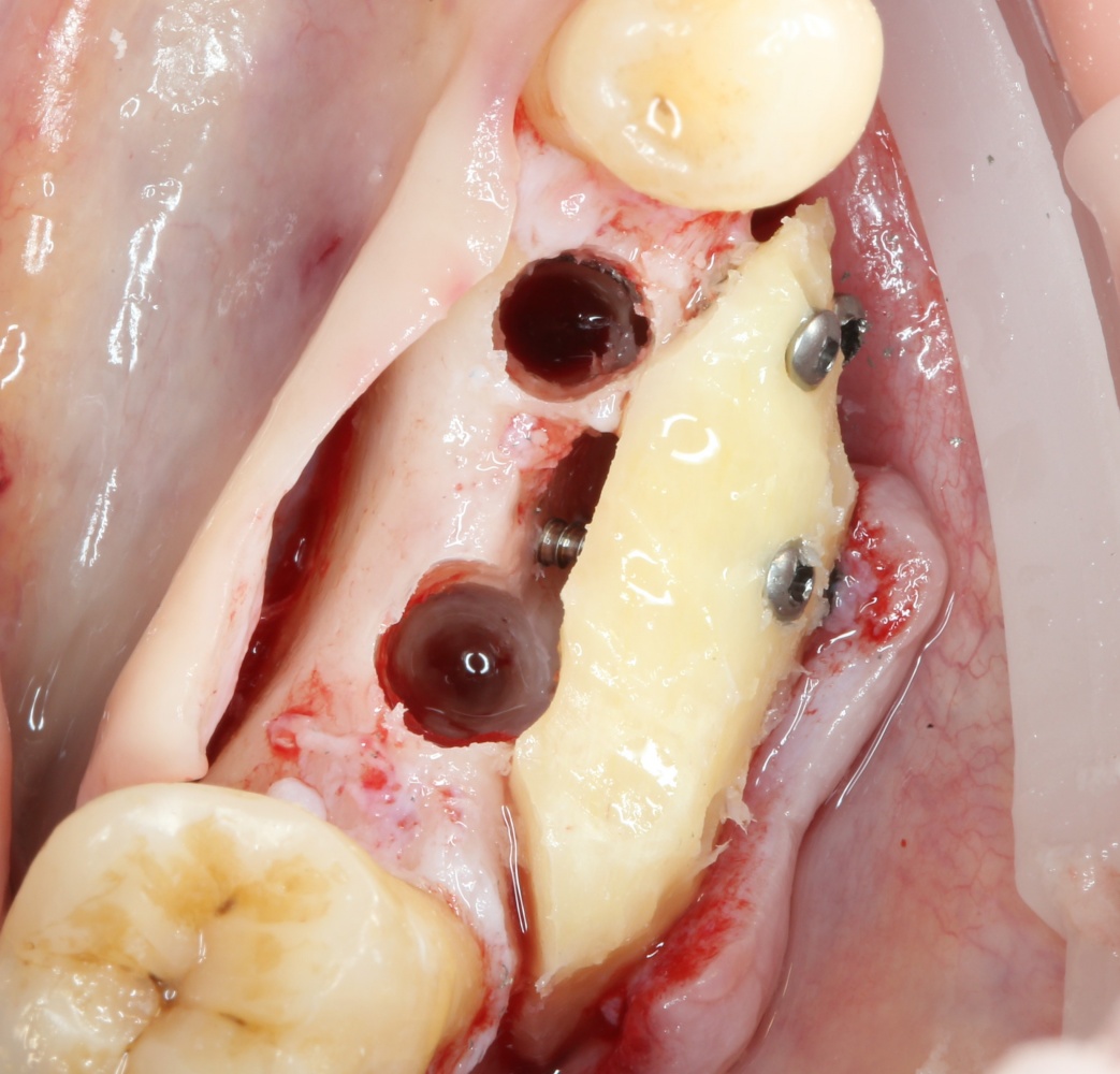 Для этого стоит использовать длинные винты. В противном случае, при подготовке лунки под имплантат костный блок может отлететь.