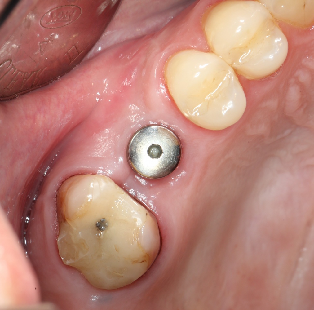А история тут была такая: доктор изначально планировал немедленную имплантацию с немедленной нагрузкой, но вдруг стабильности импланта оказалось недостаточно — и он решил закрутить его поглубже. Результат…. собственно, вы видите результат.