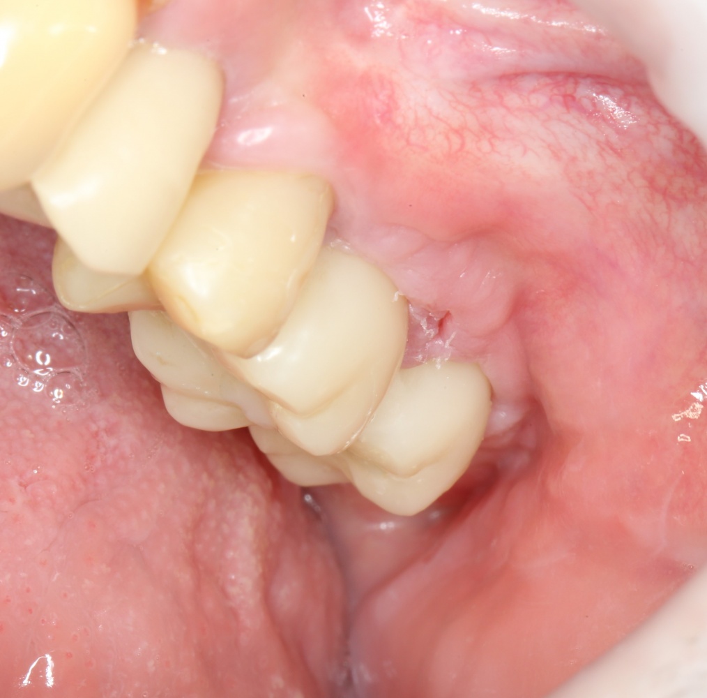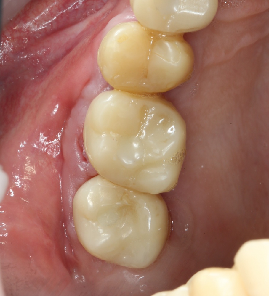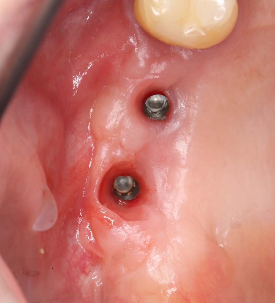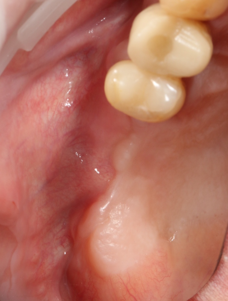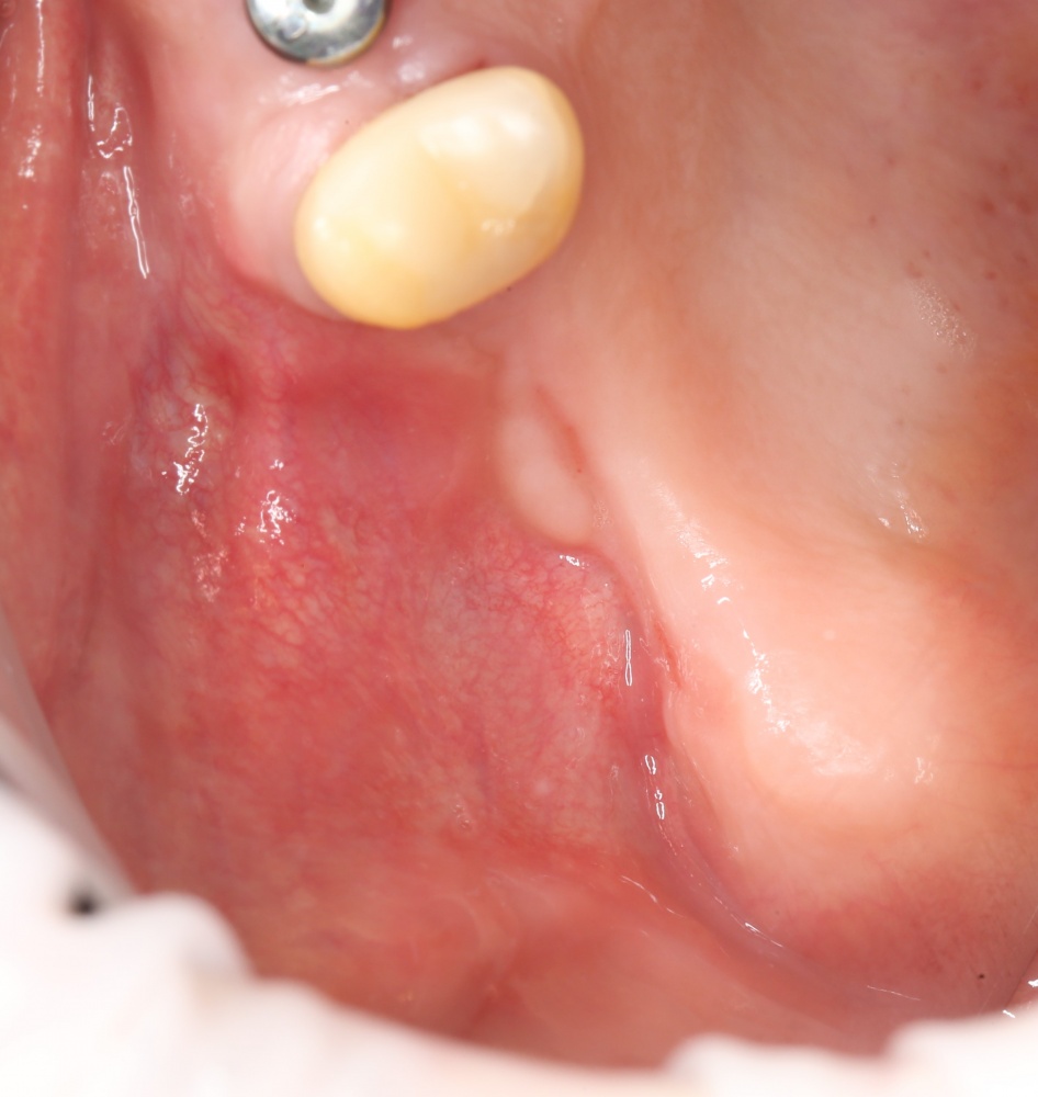 В данном клиническом случае есть одна проблема — почти полное отсутствие кератинизированной десны на вершине и с вестибулярной стороны альвеолярного гребня.