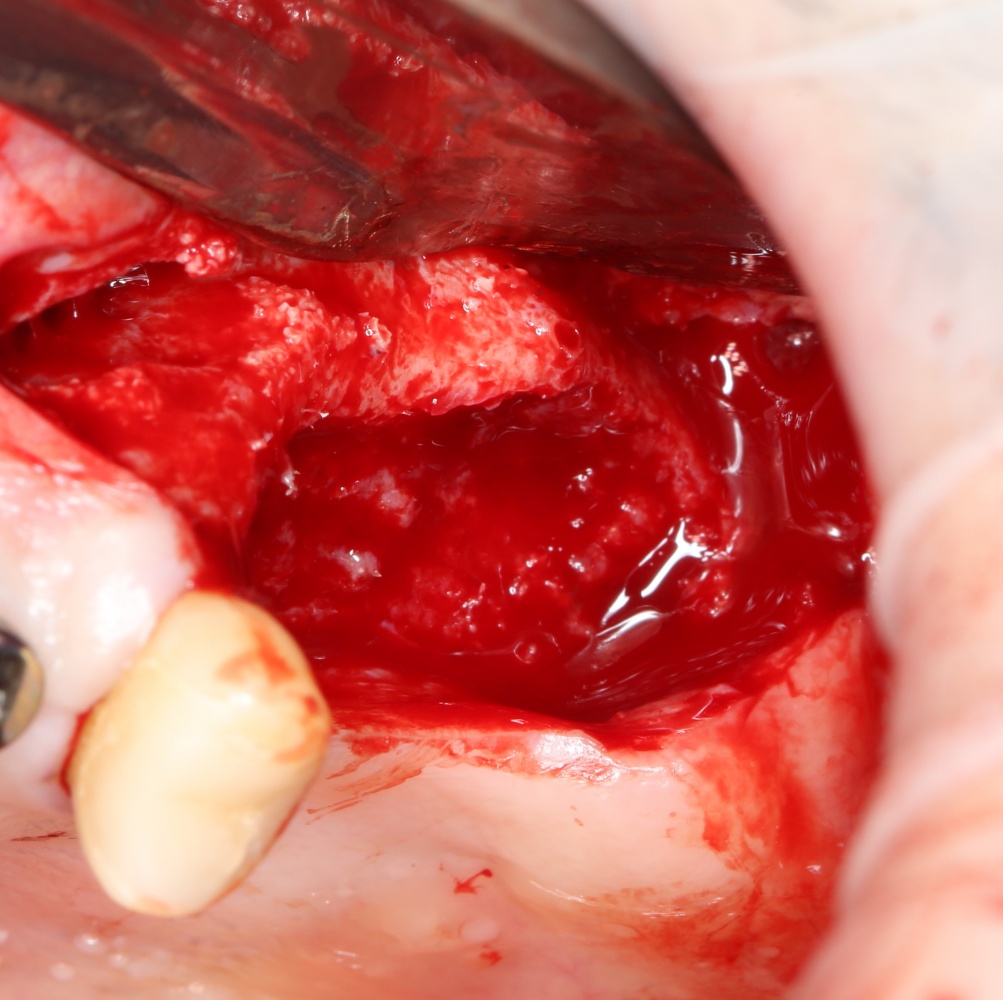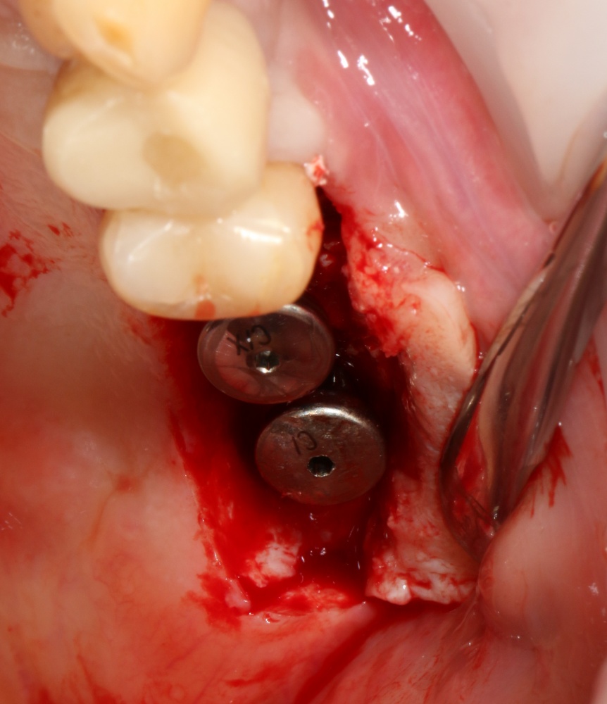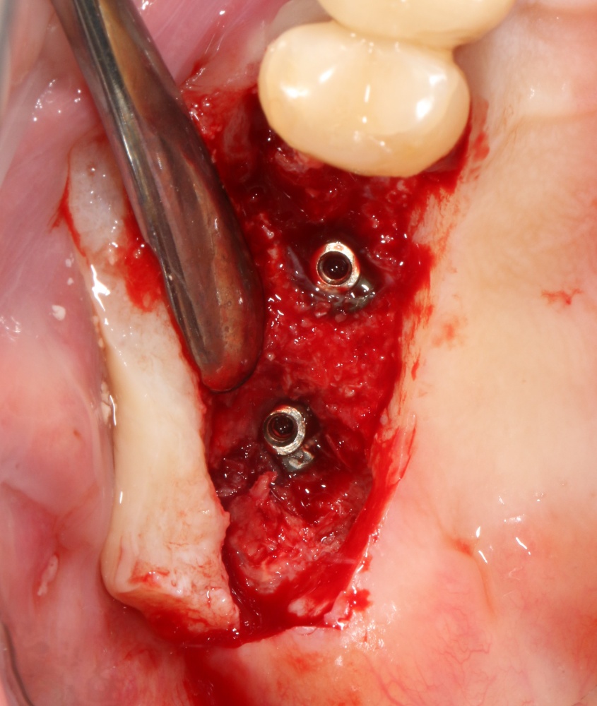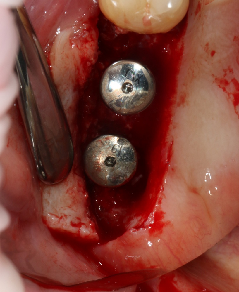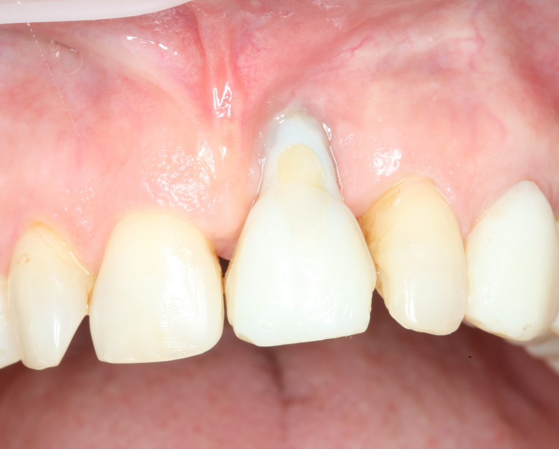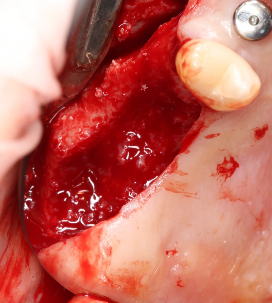 В данном клиническом случае есть одна проблема — почти полное отсутствие кератинизированной десны на вершине и с вестибулярной стороны альвеолярного гребня.