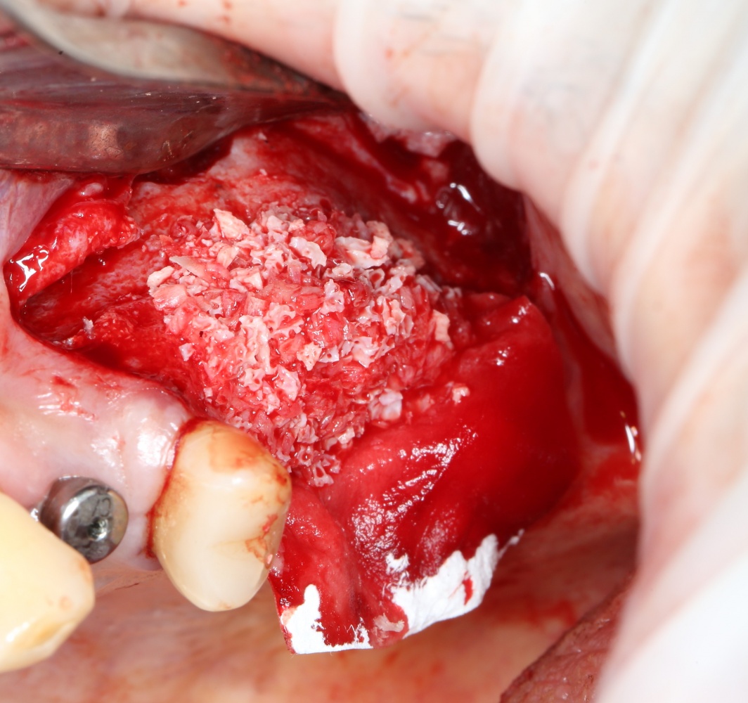 И, если в предыдущей части мы рассматривали ситуацию, когда принимающее ложе имеет относительно простой рельеф, и у нас не возникло сложностей с адаптацией аутоблока, то в случае, рассматриваемом сегодня, нормальная и точная адаптация крупного костного фрагмента, практически, невозможна. Именно поэтому мы решили использовать направленную костную регенерацию (НКР), поскольку с адаптацией тестообразного по консистенции графта проблем, обычно, никогда не бывает. Как, например, в этом случае: