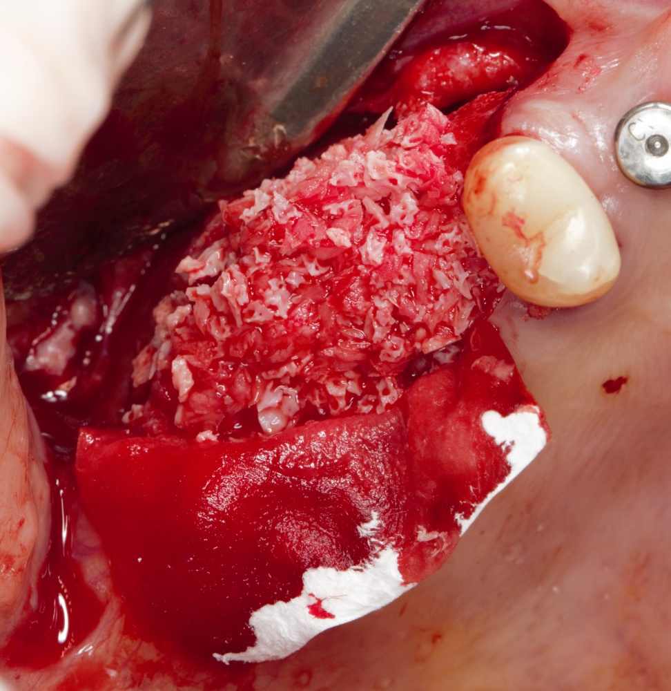 В описываемом клиническом случае нам нужно замещать достаточно большой объем костной ткани, поэтому использование ксенографта (Geistlich Bio-Oss) выглядит совершенно разумным. Мы смешиваем его с аутокостной стружкой, источником клеток и факторов роста костной ткани, в пропорции, примерно 50/50, получая, при этом, около 3 куб см готового к использованию графта: