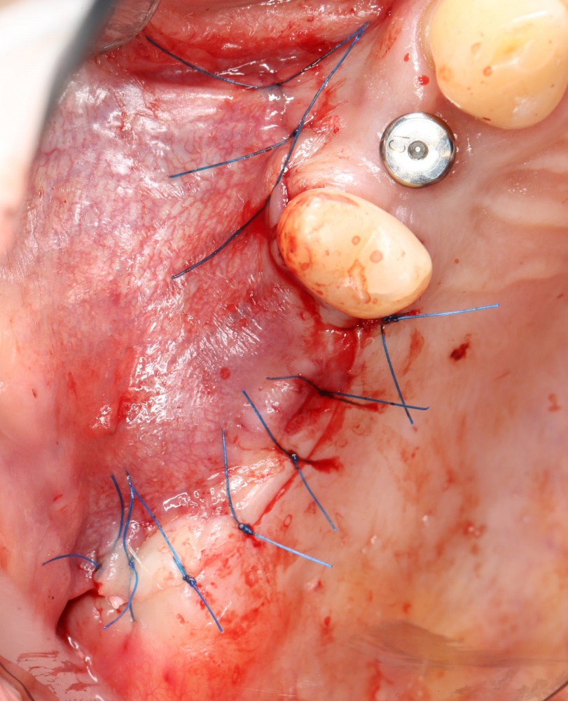 Далее, нам остается герметизировать послеоперационную рану тщательным и аккуратным наложением швов. Напомню, как разрезы, так и швы делаются в пределах кератинизированной слизистой оболочки. Это позволит уберечь рану от расхождения краев.