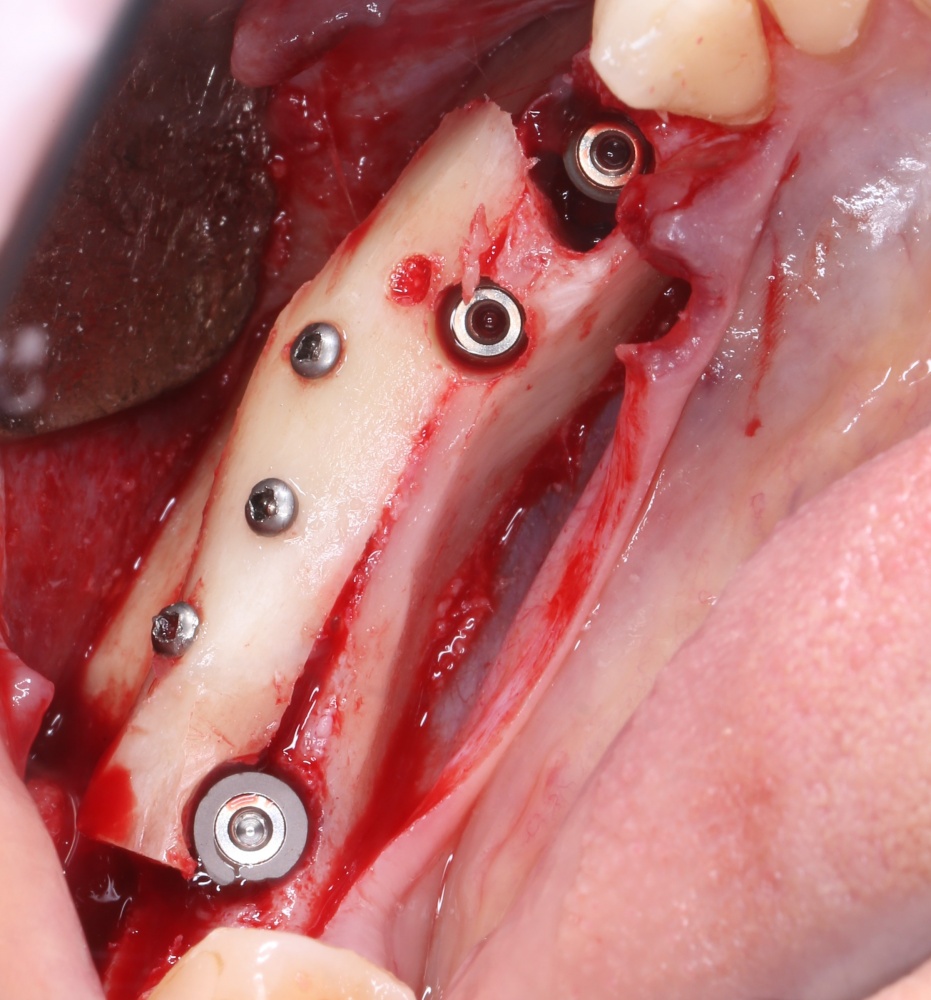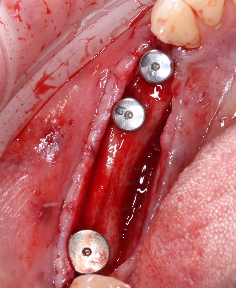 С помощью него мы «достраиваем» недостающую часть альвеолярного гребня, полностью перекрывая импланты. Напомню, что субкрестальные Ankylos Dentsply Implants вполне допускают такой подход.