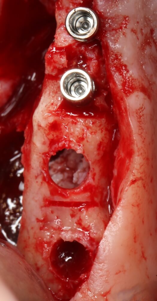 Расстояние от вершины гребня до дна гайморовой пазухи около 1 мм. Мы делаем синуслифтинг и ставим имплантаты Ankylos: