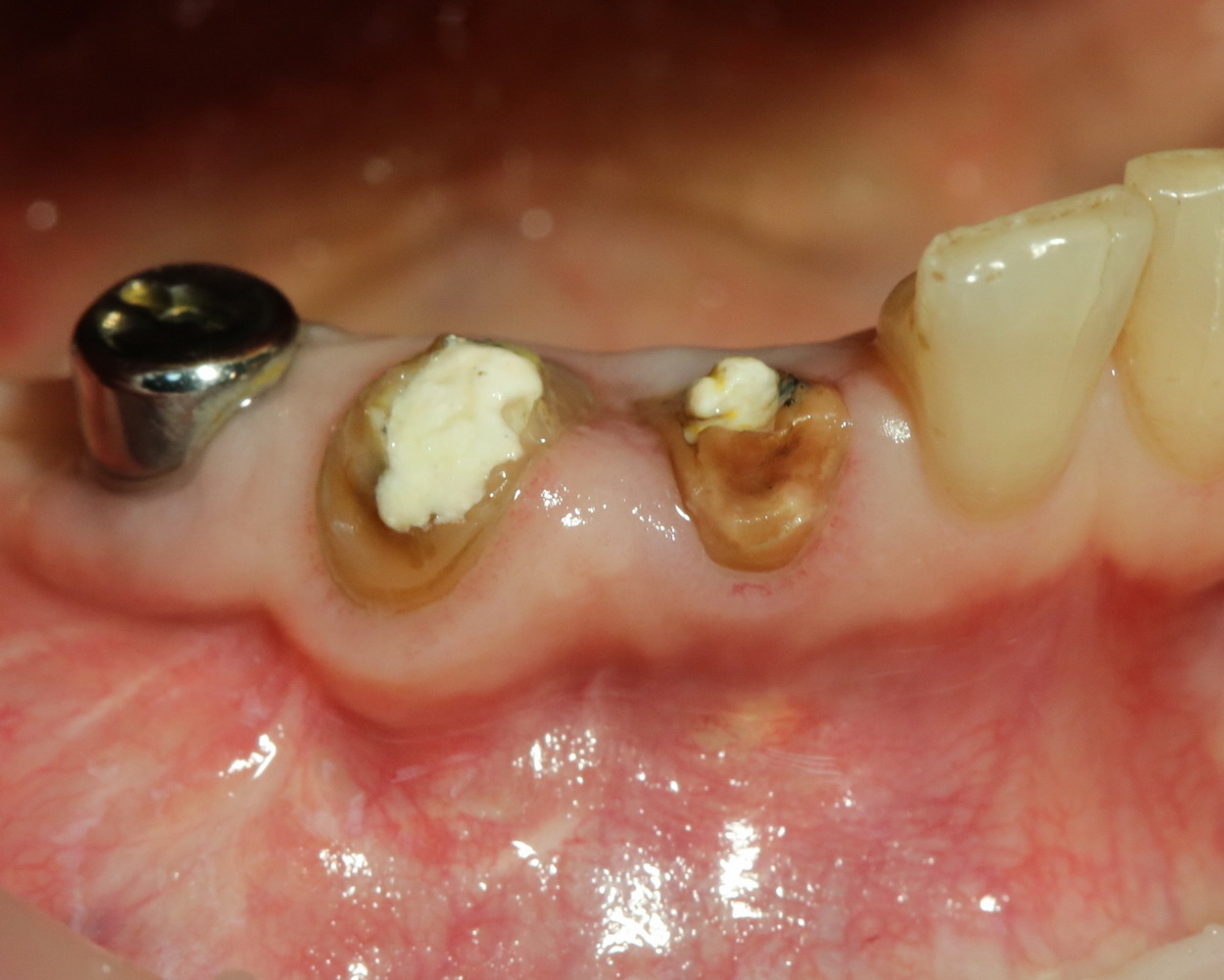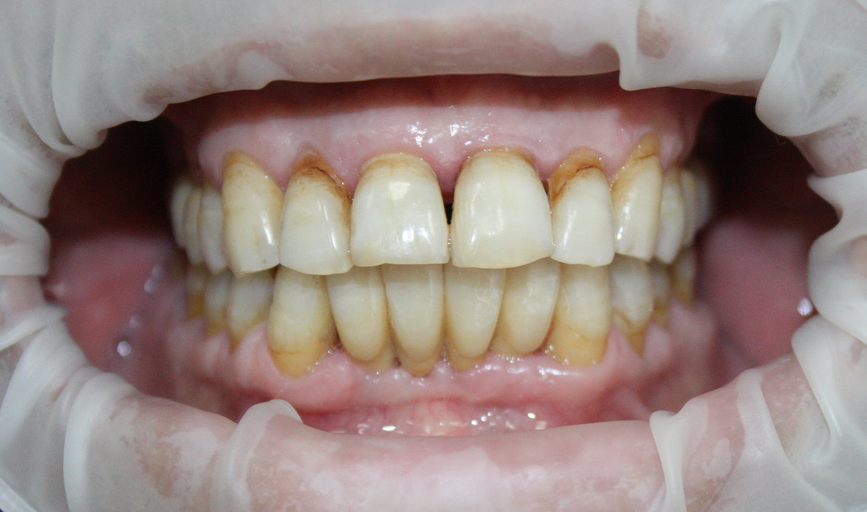 Исходная ситуация — и-за осложнений пародонтита, мы вынуждены удалить все зубы на нижней челюсти. На верхней челюсти нет зубов больше десяти лет: