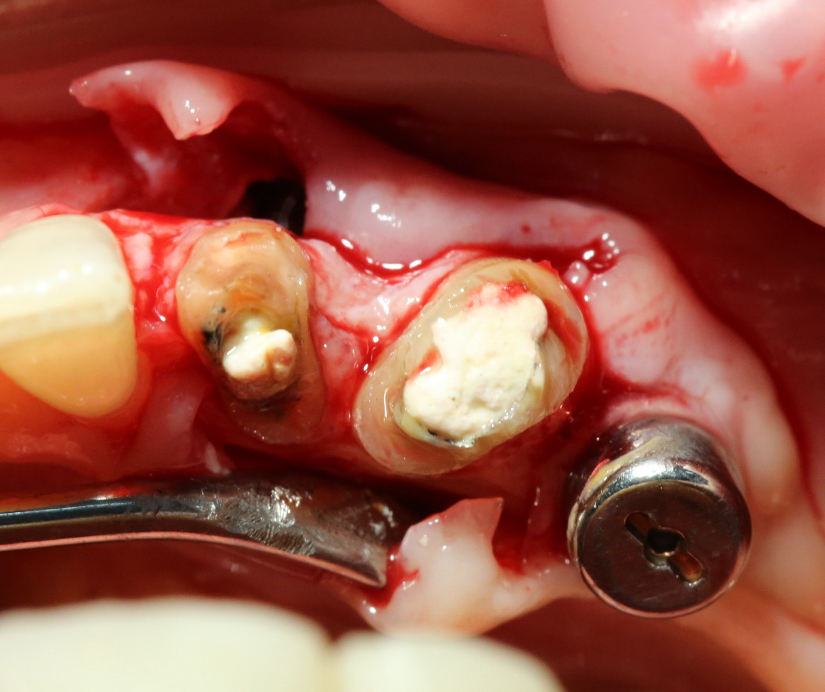 Сломался мелкий корешок где-то в глубине лунки? Промойте лунку физраствором, дистиллированной водой, раствором хлоргексидина — и у Вас будет нормальный обзор. Ни в коем случае нельзя работать вслепую.