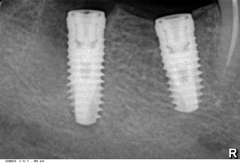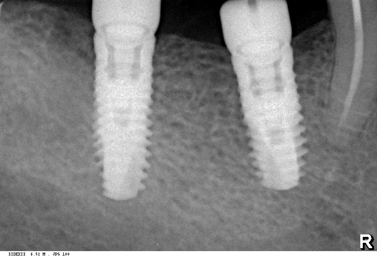 Вот пациент, ему больше пятидесяти лет. Мы удалили восьмерку и семерку, затем поставили два импланта: один в лунку седьмого зуба, а второй — на место давно отсутствующей шестерки. Снимок, сделанный сразу после имплантации (слева). Через 2,5 месяца после имплантации (справа):