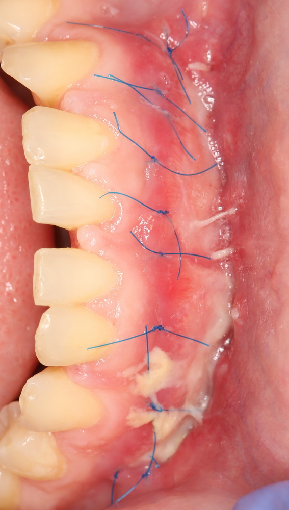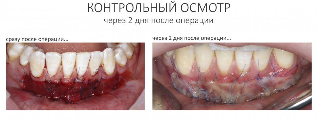 Кроме того, забор десневого трансплантата оставляет в полости рта рану, которую сложно ушить, которая находится в очень чувствительном месте и за которой весьма сложно ухаживать. Я уже не говорю о том, что с донорским участком связан основной дискомфорт и большинство осложнений после гингивопластических операций — за примерами далеко ходить не нужно. При этом мы существенно ограничены в объемах получения трансплантатов, а у людей с «тонким» биотипом слизистой оболочки получить трансплантат для изменения толщины десны вообще невозможно.