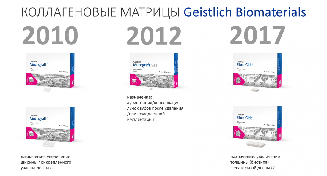 Все эти проблемы были выявлены не вчера, они известны всем и очень хорошо изучены. Работа над их решением шла в разных направлениях: были попытки использовать дермальные трансплантаты, экспандеры, тефлоновые пленки и т. д. Но дальше всех в этом продвинулась компания Geistlich Pharma, предложив использовать для восполнения дефектов слизистой оболочки ксенотрансплантаты — по аналогии с ксенографтами для кости.