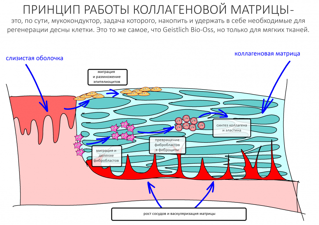 По принципу действия коллагеновая матрица является графтом. Её главная задача — накопить в себе побольше клеток, чтобы стать каркасом для будущей ткани. Для того, чтобы накопить клетки, она должна быть проницаема — иначе, как клетки в неё проникнут? Сразу после операции матрица заполняется клетками крови, в результате чего образуется что-то вроде «армированного» кровяного сгустка. Внутри него происходят те же самые процессы свёртывания крови, образования фибриновых нитей, ретракция и т. д., в результате чего получается армированный коллагеновыми волокнами тромб. Эффективность матрицы во многом будет определяться толщиной этого сформированного тромба, который в течение некоторого времени становится непроницаемым, набирает прочность, нём запускается гистогенез, ангиогенез и т. д. Строго говоря, то же самое происходит при любой травме, сопровождаемой повреждением тканей и сосудов — будь то кожа, слизистая и т. д. Коллагеновая матрица просто делает тромб более предсказуемым, стабильным и долгоживущим.