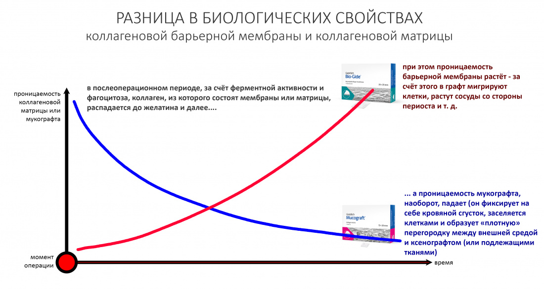 Коллагенсодержащие биоматериалы, в том числе матрицы и мембраны, разрушаются организмом при помощи вырабатываемых им коллагеназ, но в условиях отсутствия яркой тканевой реакции и влияния микрофлоры этот процесс растягивается на время, достаточное для начальной фазы регенерации костной ткани или десны. Собственно, в этом заключается главный принцип их использования.
