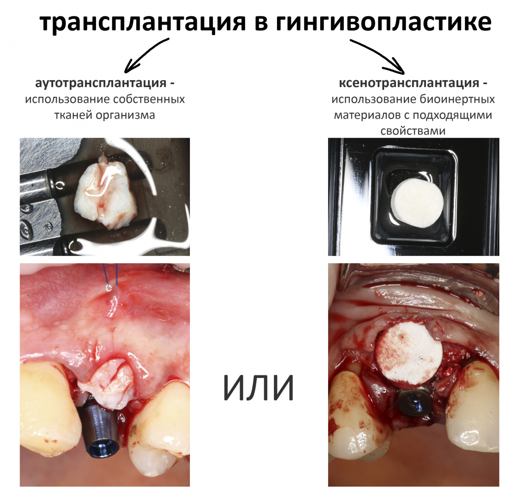 Второй группой методов гингивопластических операций являются трансплантации. Необходимость в трансплантациях возникает в тех клинических случаях, где мы сталкиваемся с существенным дефицитом какого-либо параметра десны, либо с невозможностью решения клинической задачи путём модификации. В таких ситуациях мы используем трансплантат, который нужно откуда-то взять.