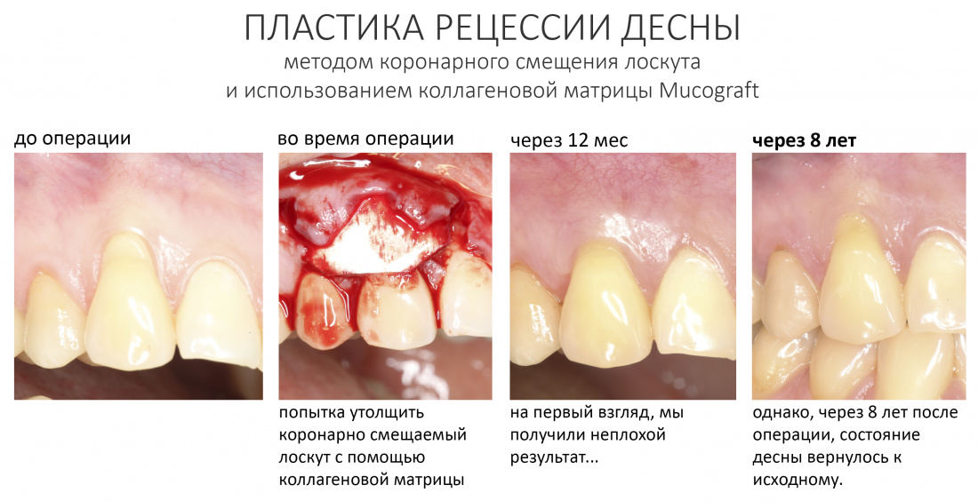 но если кратко, то чем дольше и интенсивнее протекает постоперационное воспаление, чем хуже гигиена полости рта (во рту больше микробов) — тем быстрее происходит разрушение коллагена в матрице, тем быстрее она теряет свои свойства. Как и в случае с минеральным ксенографтом, для достижения наилучшего результата лечения нам нужно, чтобы коллагеновая матрица сохраняла свою структуру как можно дольше — вот почему для проведения гингивопластических операций важны как хороший уровень гигиены полости рта, так и грамотное постоперационное ведение пациента. В противном случае, вместо результата лечения мы получаем какую-то фигню и навсегда теряем интерес к биоматериалам.