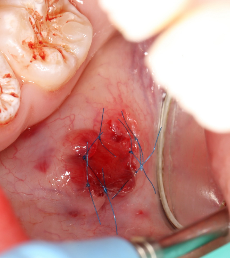 Также следует заметить, что образовавшаяся после удаления опухоли и зуба полость не заполняется никакими биоматериалами, за исключением гемостатической губки. Во-первых, нет необходимости, во-вторых, это очень дорого, в-третьих, биоматериал может помешать нормальному заживлению операционной раны.