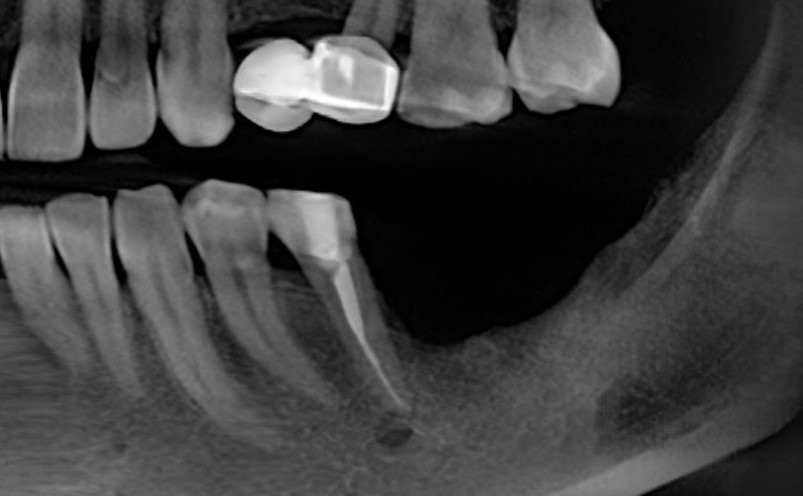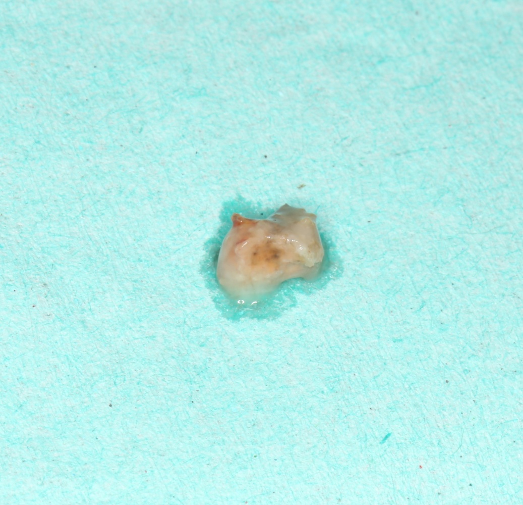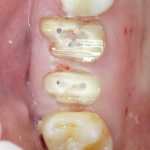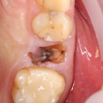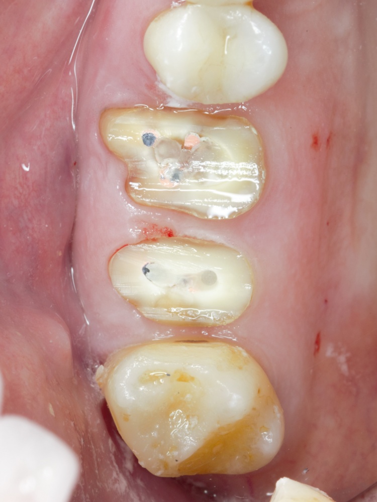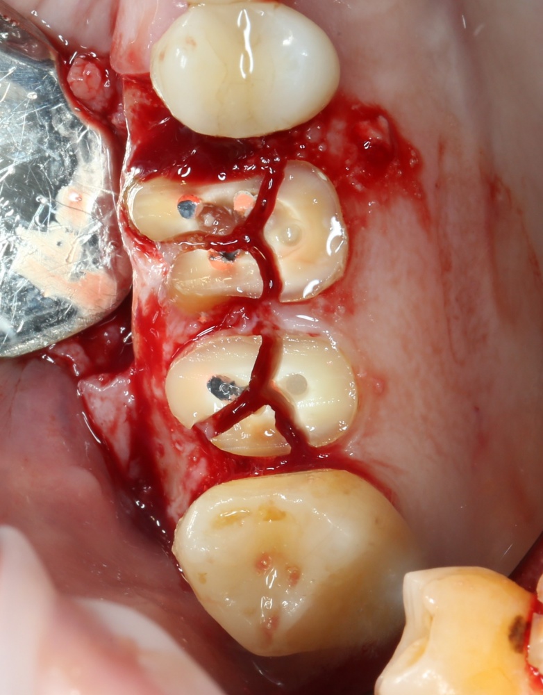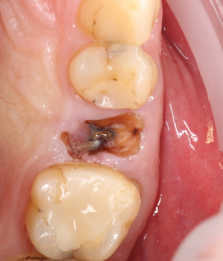 Ремарка: еще на этапе консультации с участием стоматолога-ортопеда, мы признали 44 зуб негодным и решили его удалить. Перед проведением разреза мы убрали коронку с 44 зуба и подготовили его к удалению. Так мы избежим попадания фрагментов коронки в открытую рану, а проведение самого разреза получится проще и аккуратнее.