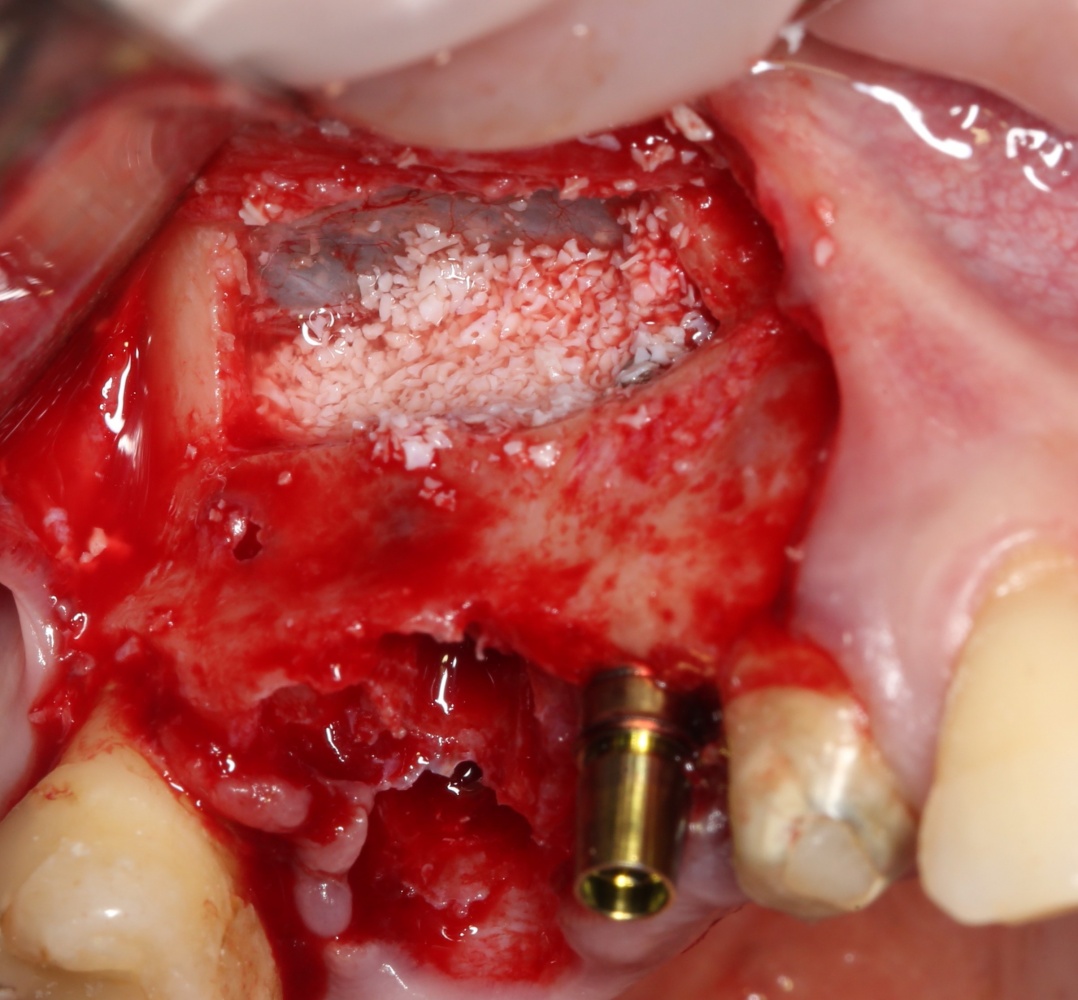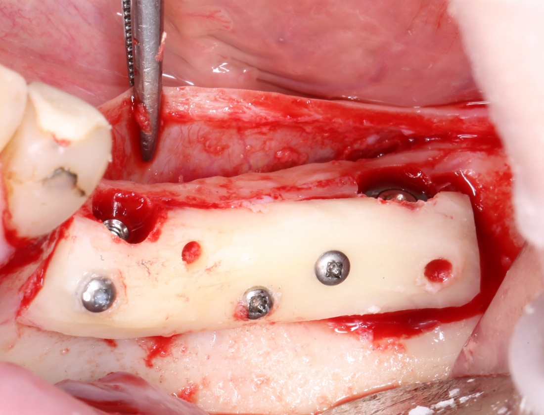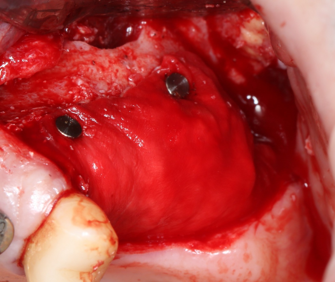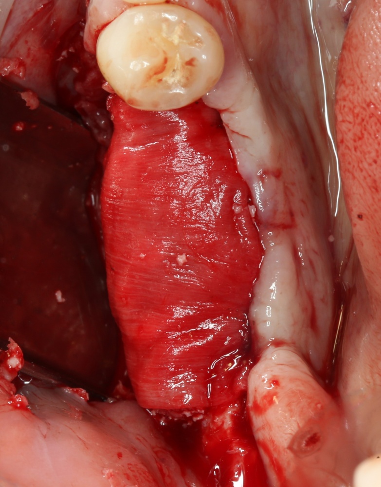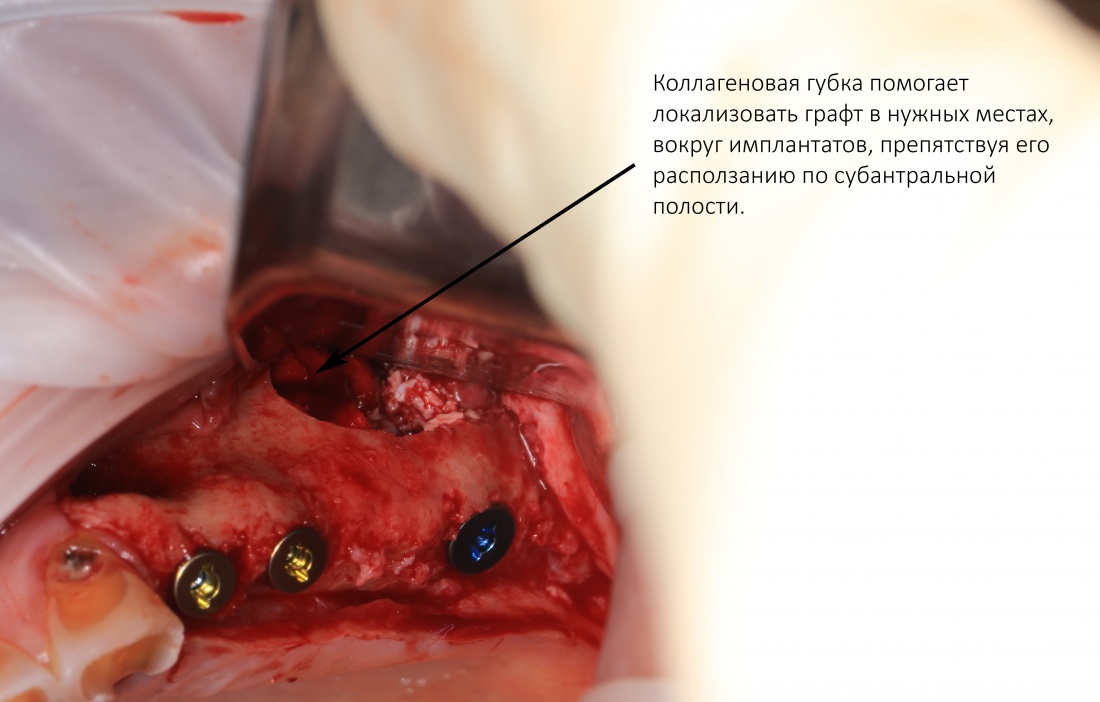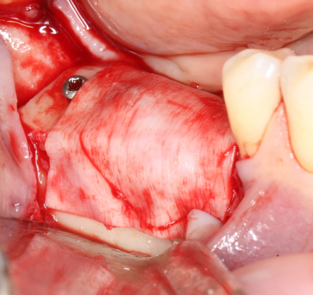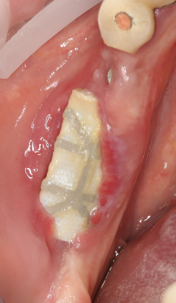 Конкретно в этом клиническом случае между костным аутотрансплантатом, ложем и имплантатами есть пустое пространство. Если его не изолировать от мягких тканей, они прорастут и осложнят интеграцию аутографта. Поэтому я решил перекрыть костный блок барьерной мембраной, пусть это делает хирургическую операцию немного дороже.