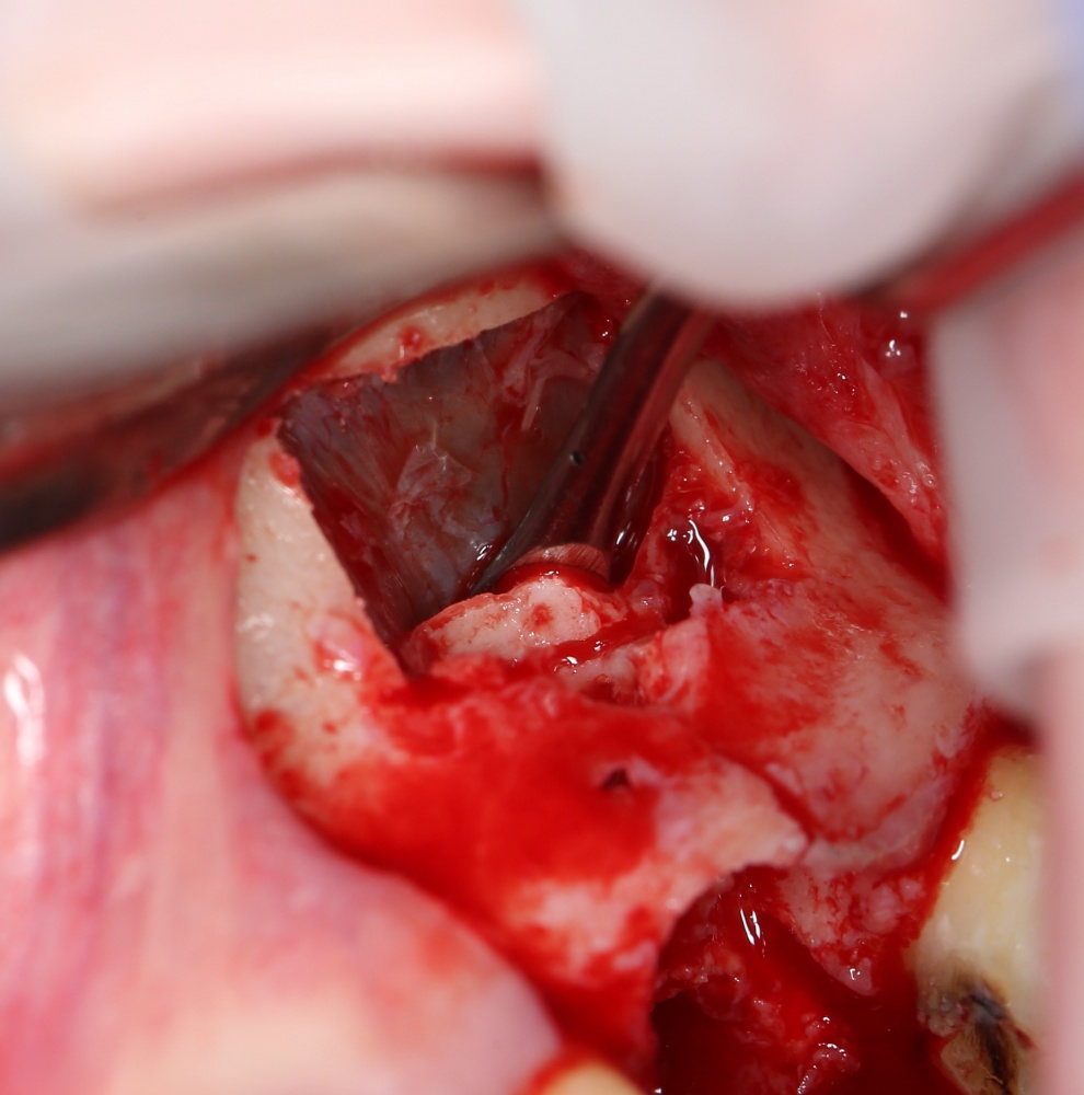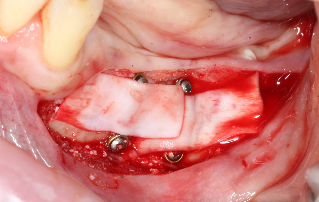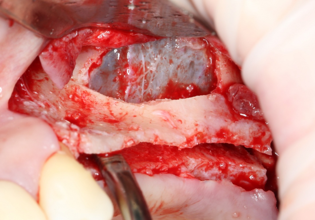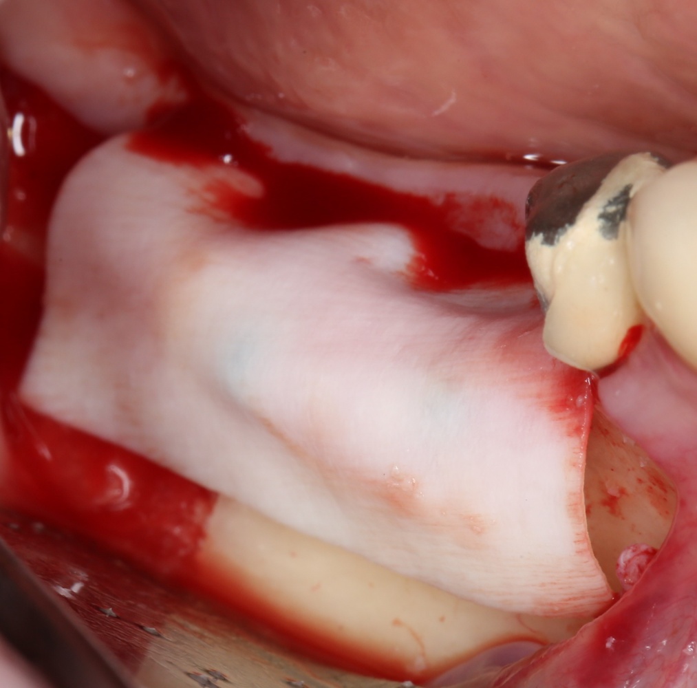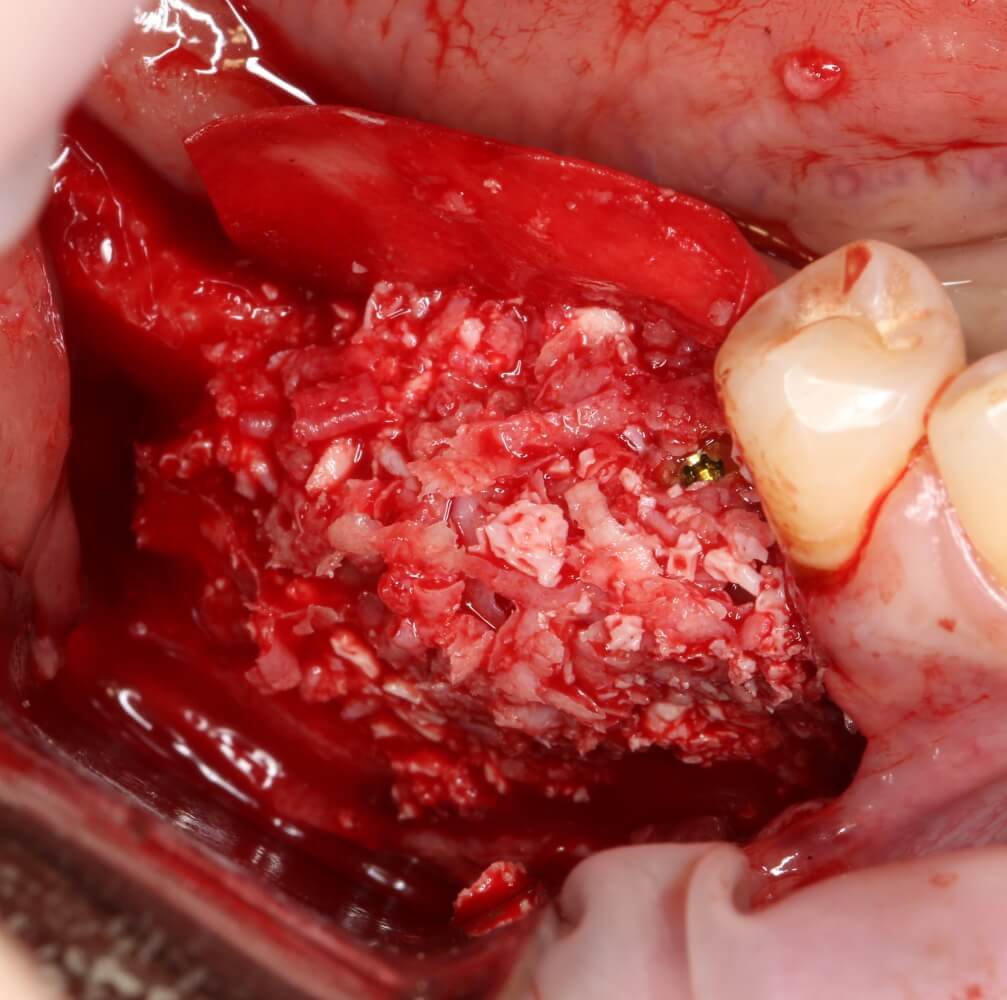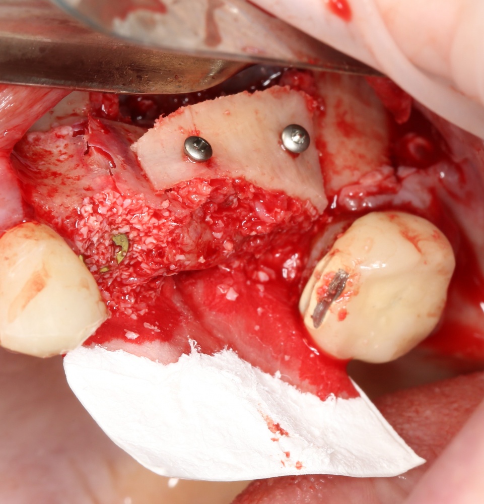 Конкретно в этом клиническом случае между костным аутотрансплантатом, ложем и имплантатами есть пустое пространство. Если его не изолировать от мягких тканей, они прорастут и осложнят интеграцию аутографта. Поэтому я решил перекрыть костный блок барьерной мембраной, пусть это делает хирургическую операцию немного дороже.