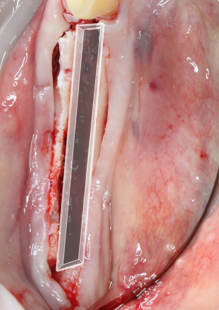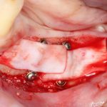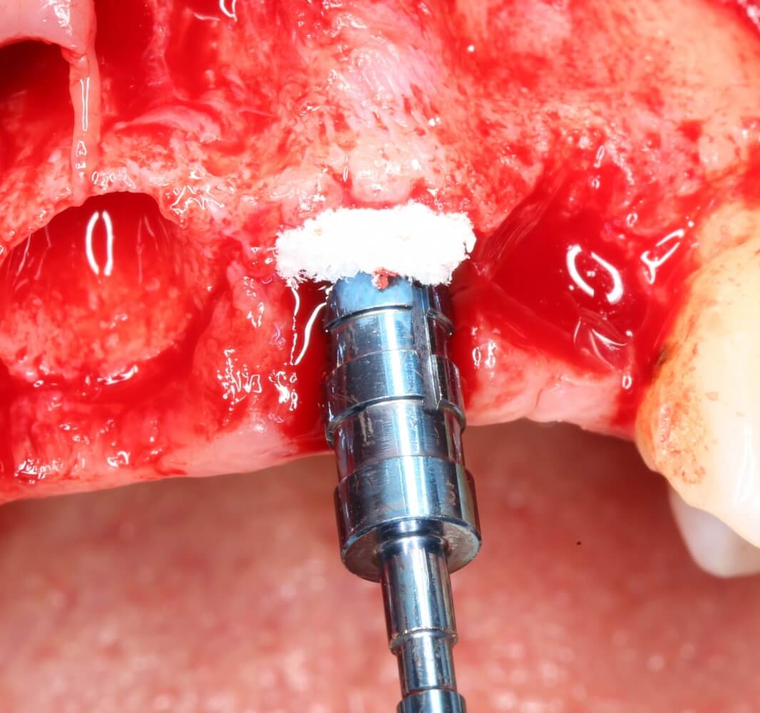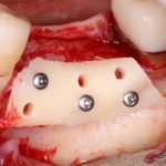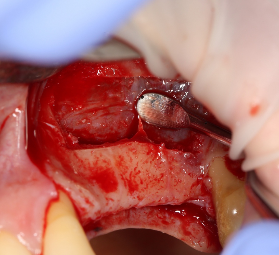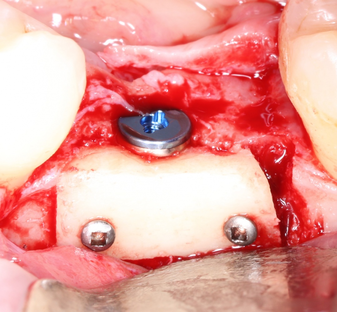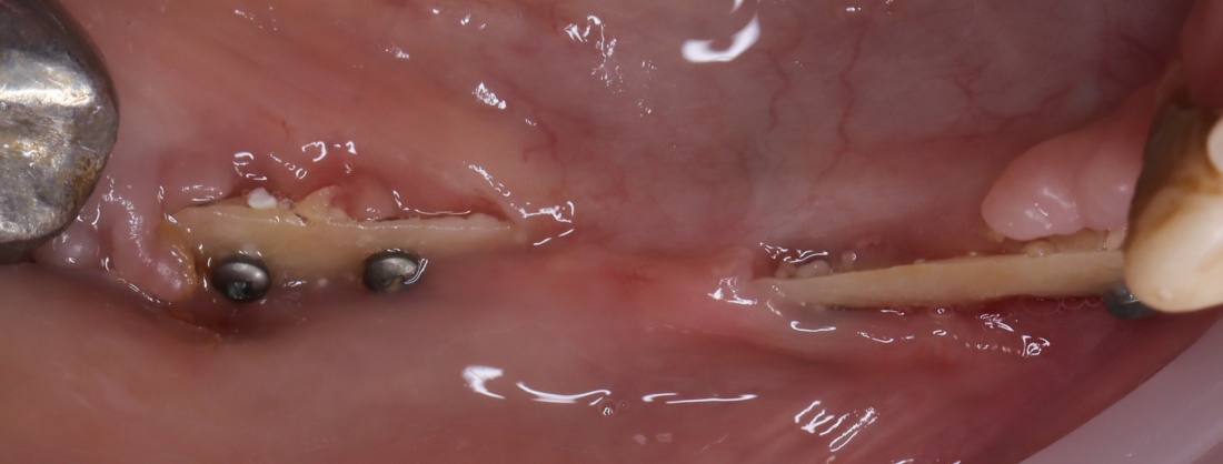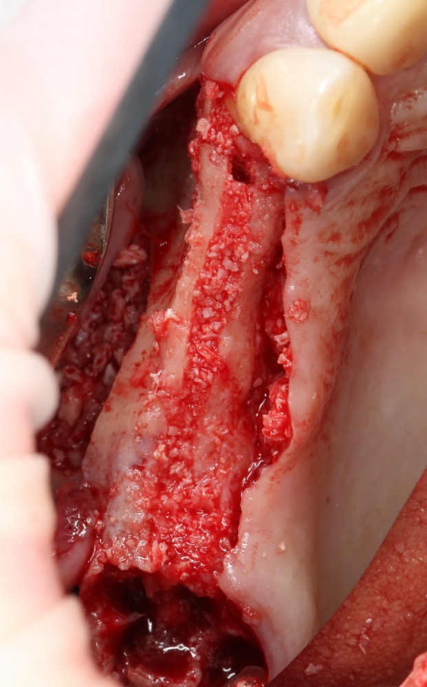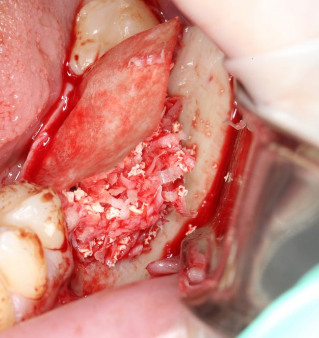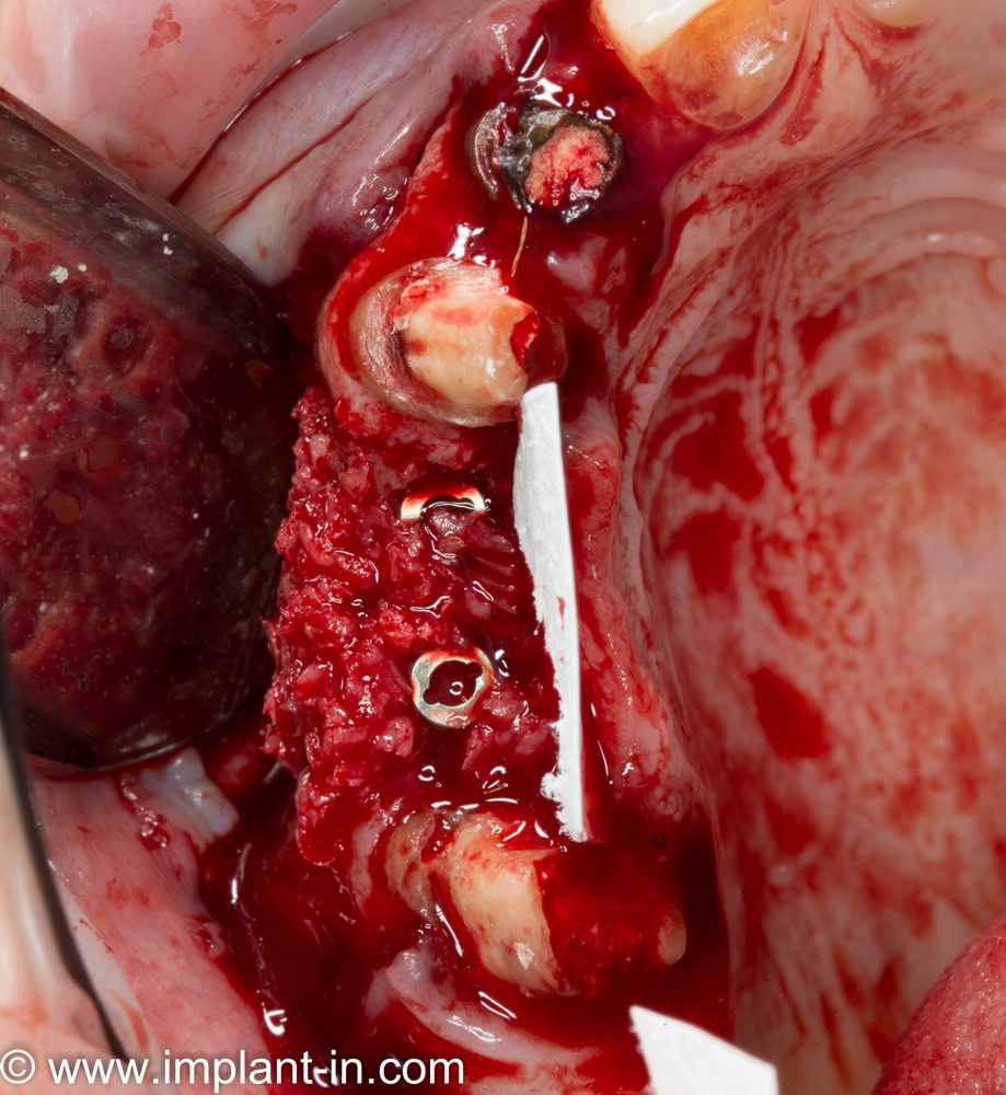 Конкретно в этом клиническом случае между костным аутотрансплантатом, ложем и имплантатами есть пустое пространство. Если его не изолировать от мягких тканей, они прорастут и осложнят интеграцию аутографта. Поэтому я решил перекрыть костный блок барьерной мембраной, пусть это делает хирургическую операцию немного дороже.