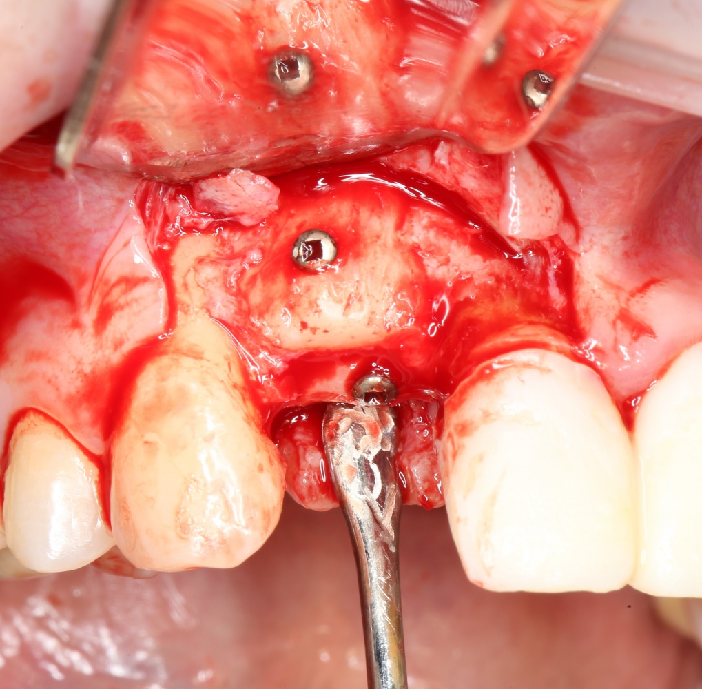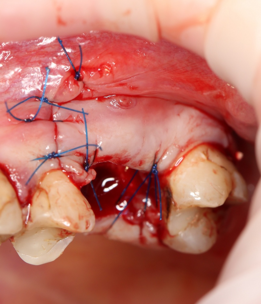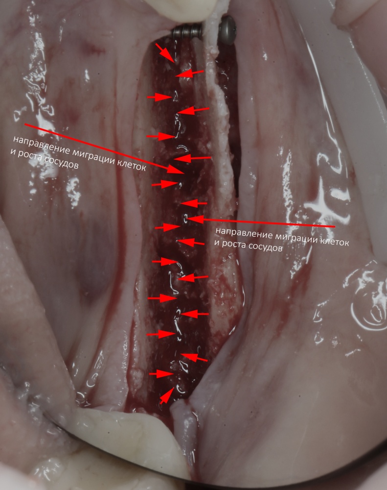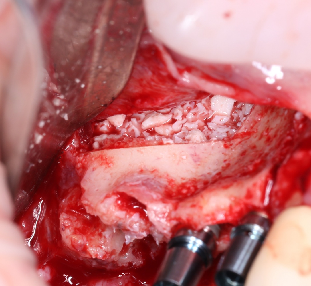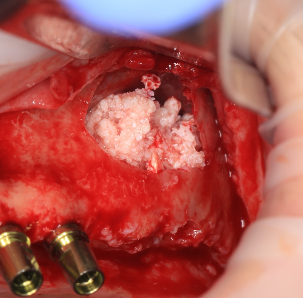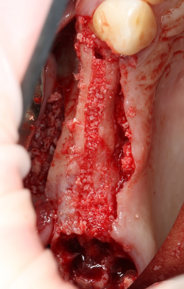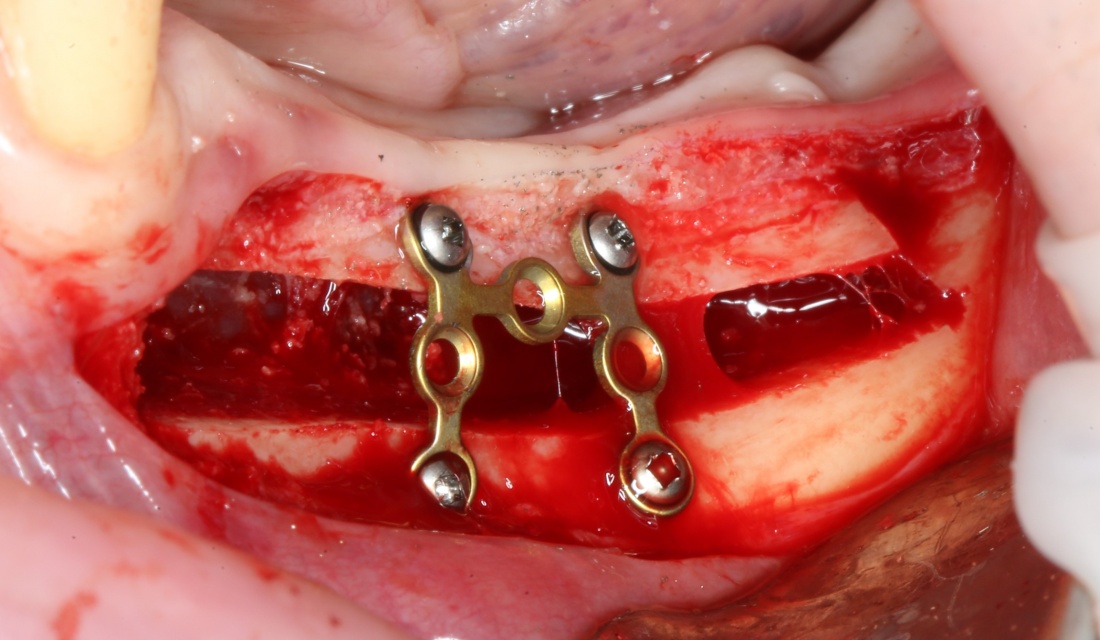 Конкретно в этом клиническом случае между костным аутотрансплантатом, ложем и имплантатами есть пустое пространство. Если его не изолировать от мягких тканей, они прорастут и осложнят интеграцию аутографта. Поэтому я решил перекрыть костный блок барьерной мембраной, пусть это делает хирургическую операцию немного дороже.