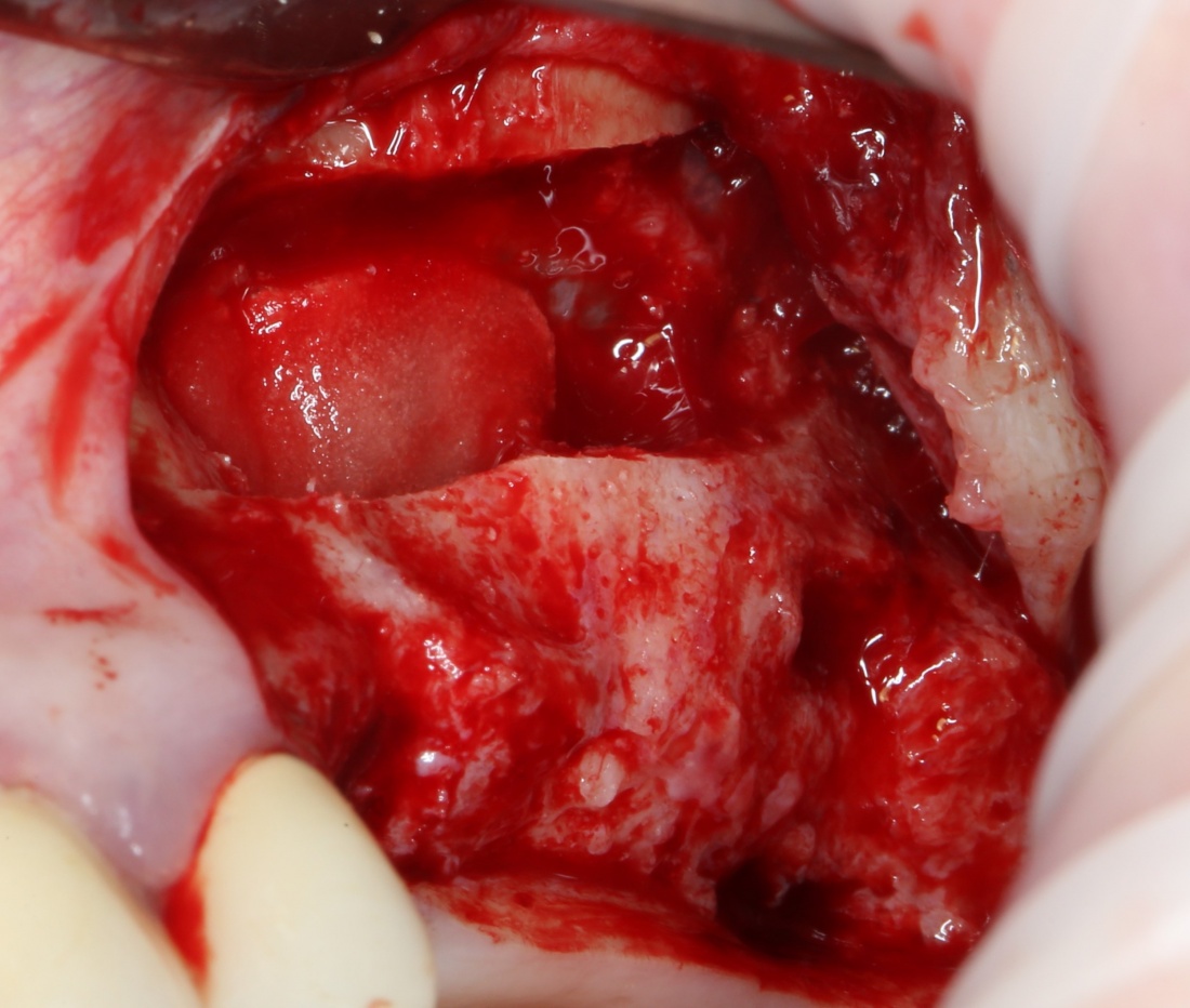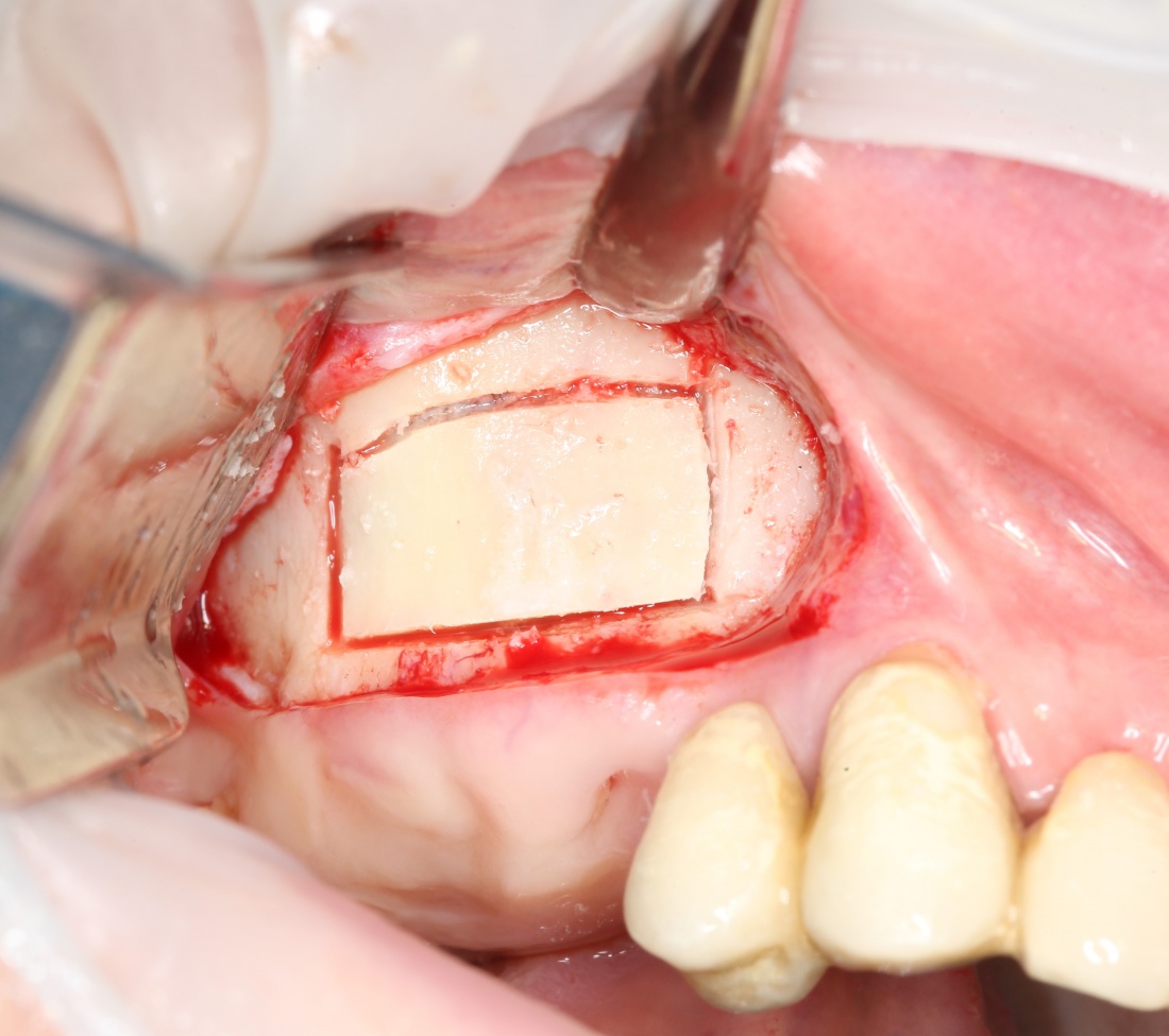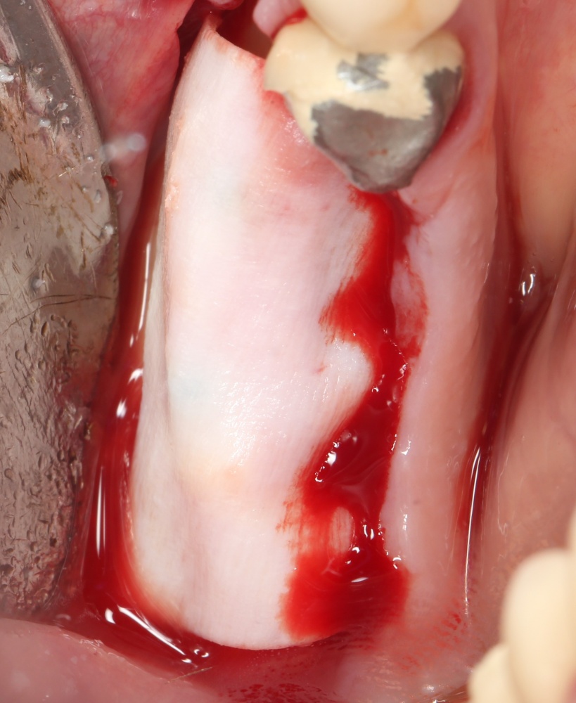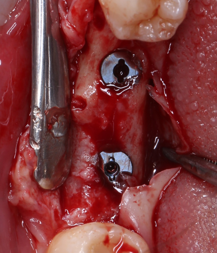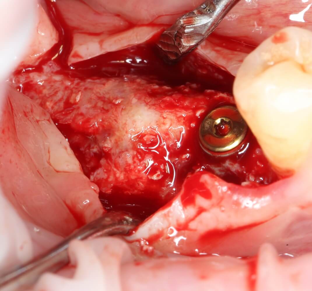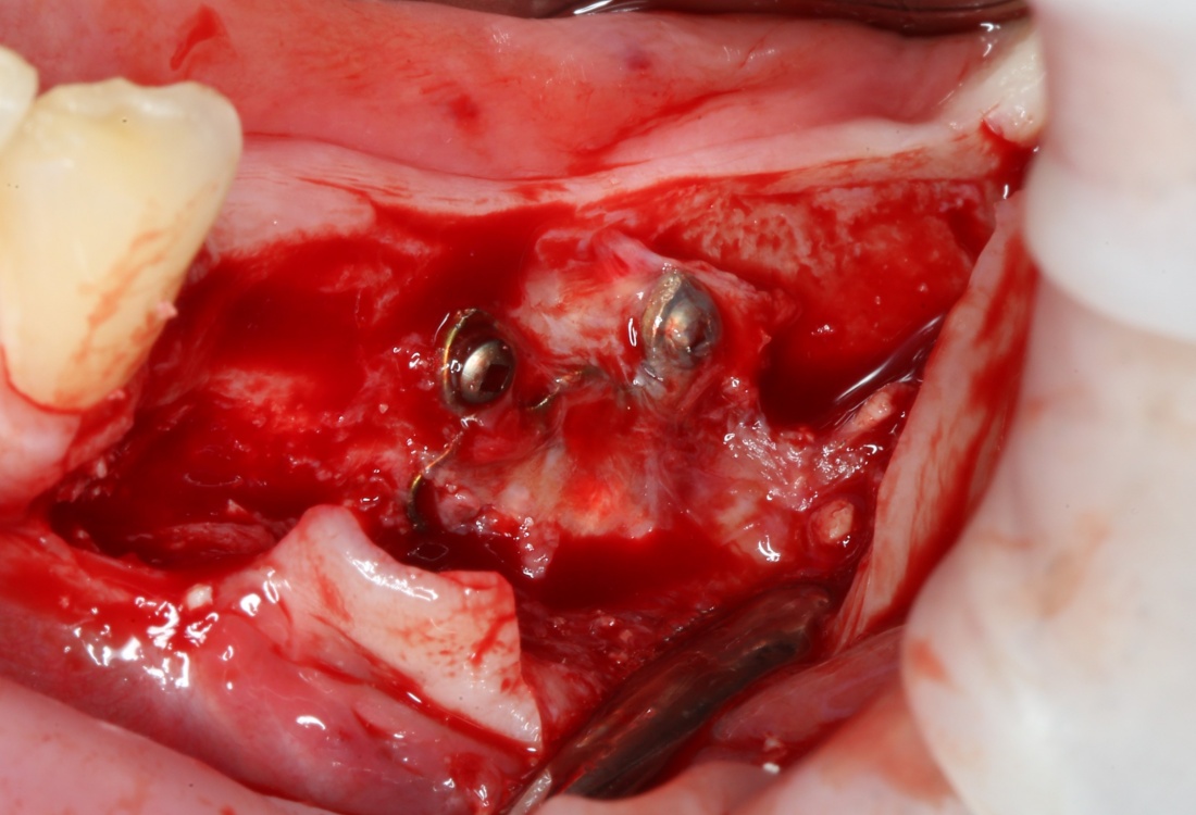 Конкретно в этом клиническом случае между костным аутотрансплантатом, ложем и имплантатами есть пустое пространство. Если его не изолировать от мягких тканей, они прорастут и осложнят интеграцию аутографта. Поэтому я решил перекрыть костный блок барьерной мембраной, пусть это делает хирургическую операцию немного дороже.